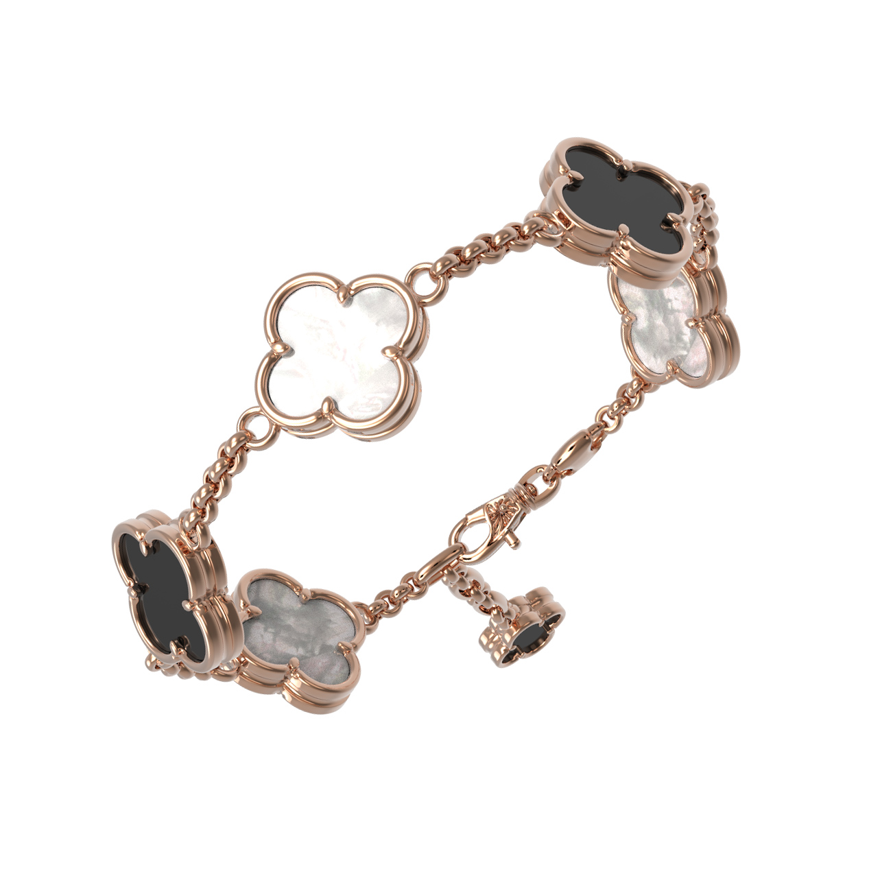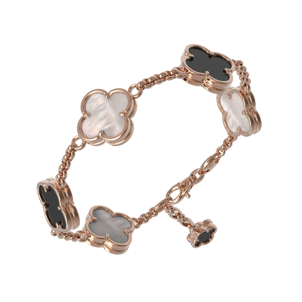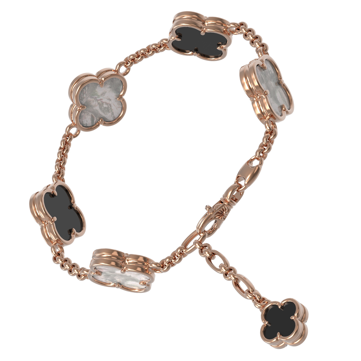 Элегантный золотой браслет из коллекции De Luxe — Клевер весна станет безупречным дополнением вашего образа, подчеркивая утонченный вкус и внимание к деталям. Это украшение выполнено из красного золота 585 пробы, чей теплый оттенок гармонично сочетается с классическим дизайном в форме клевера. Ювелирная композиция строится на контрасте: три вставки из натурального черного оникса и перламутра создают завораживающую игру света и цвета, придавая изделию особую глубину и выразительность.