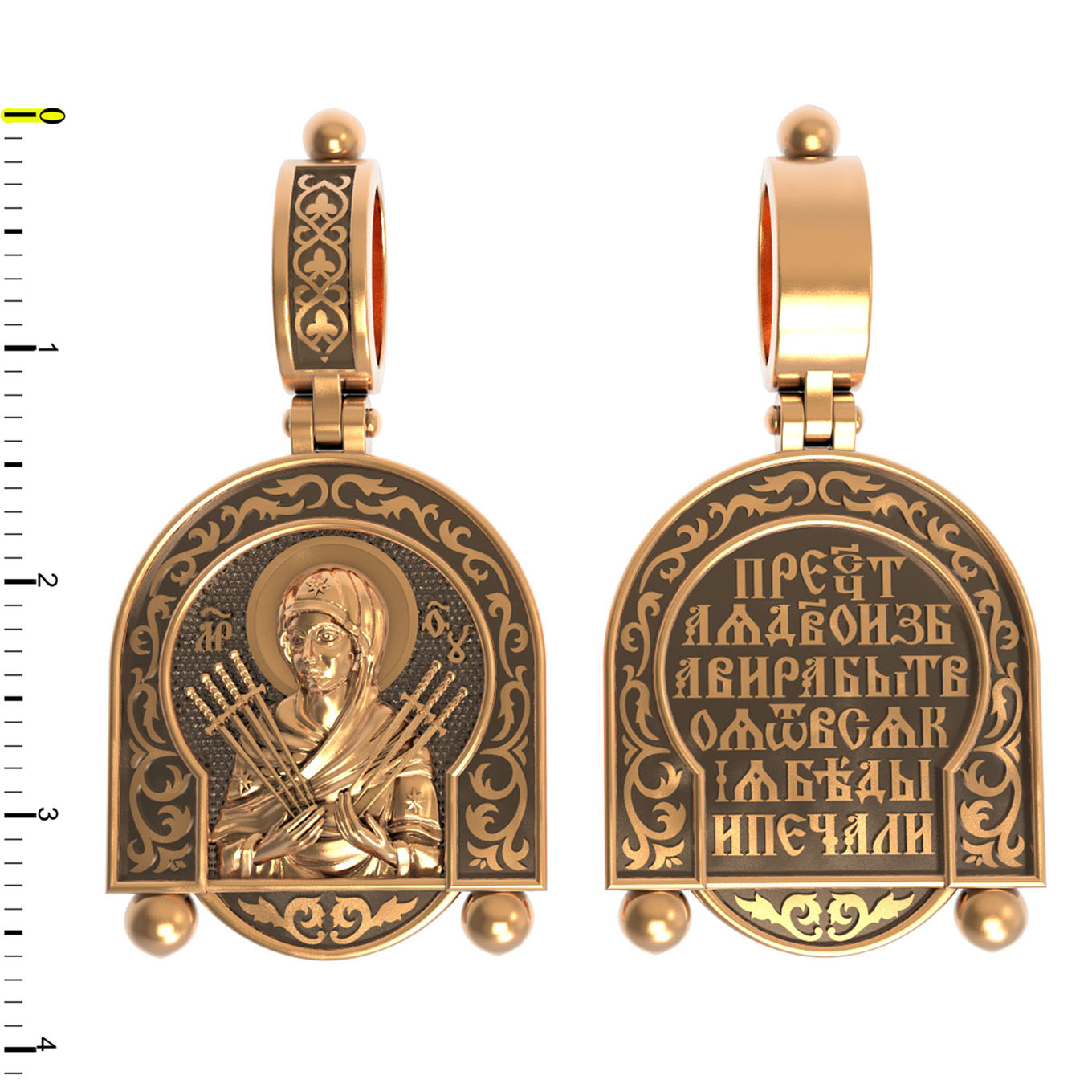 На лицевой стороне образка изображена икона Пресвятой Богородицы «Семистрельная» — одна из самых чудотворных икон на Руси. На протяжении многих веков христиане взывали к Царице Небесной через эту икону, если в стране начинались войны или мятежи.