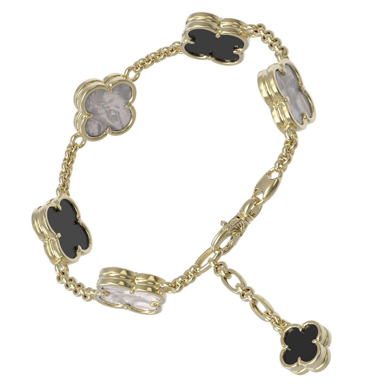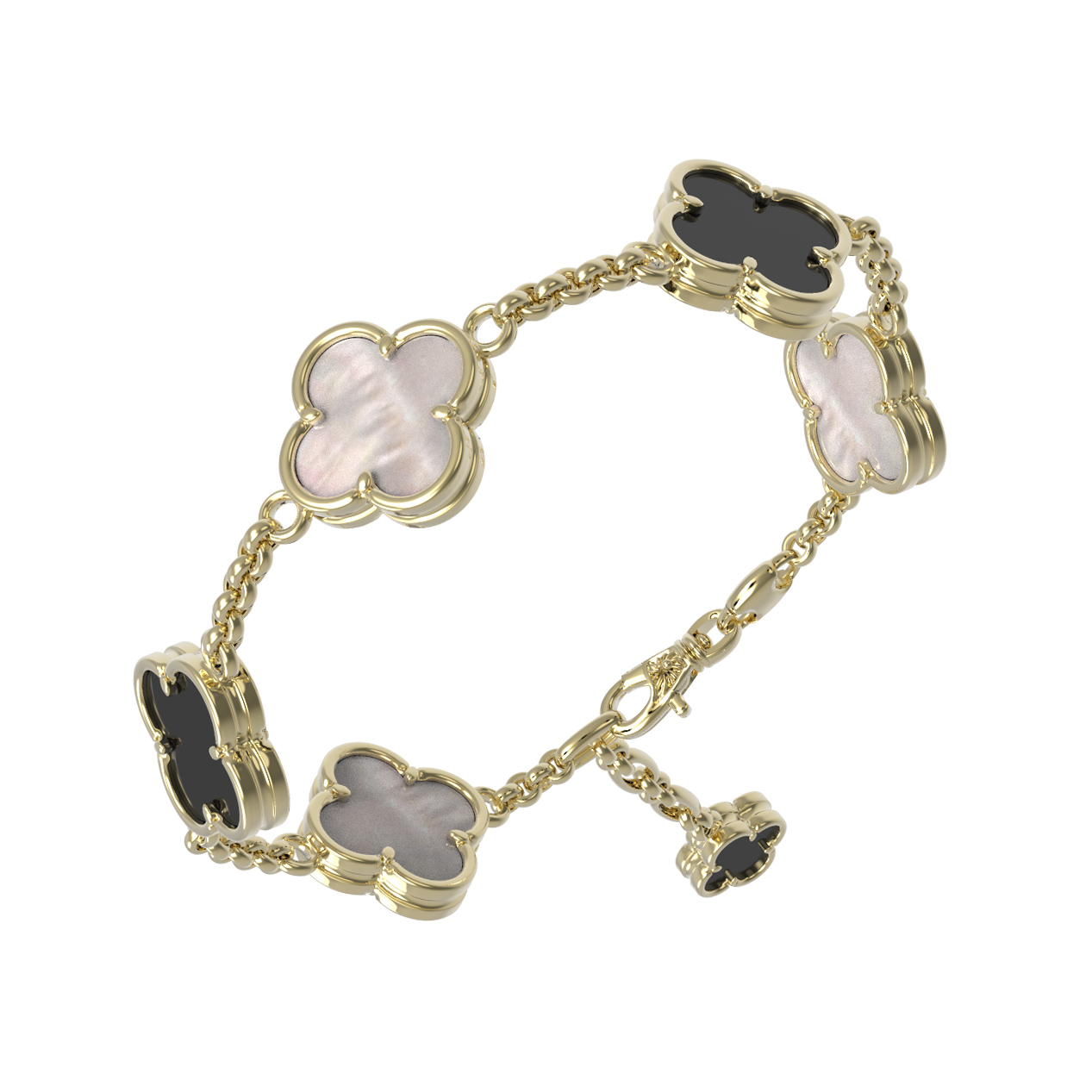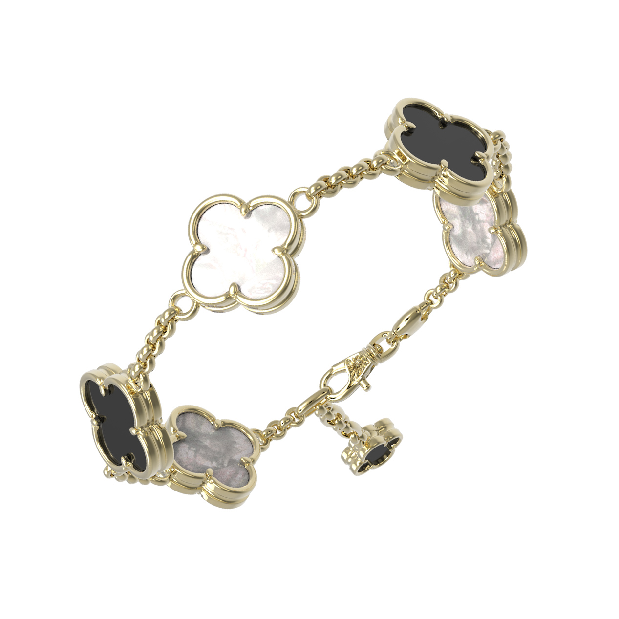 Композиция браслета строится на контрасте и балансе: в изделии использовано 3 вставки из натурального оникса и перламутра. Глубокий черный цвет оникса эффектно сочетается с нежным переливом перламутра, создавая стильный визуальный ритм. Каждая деталь проработана с вниманием к ювелирным традициям, что делает этот браслет универсальным аксессуаром.