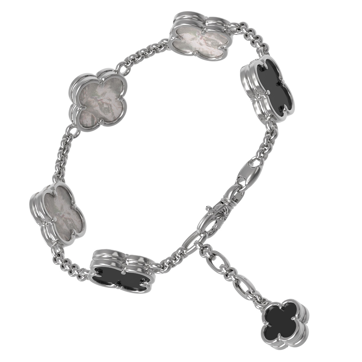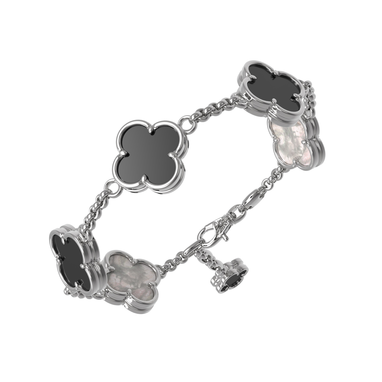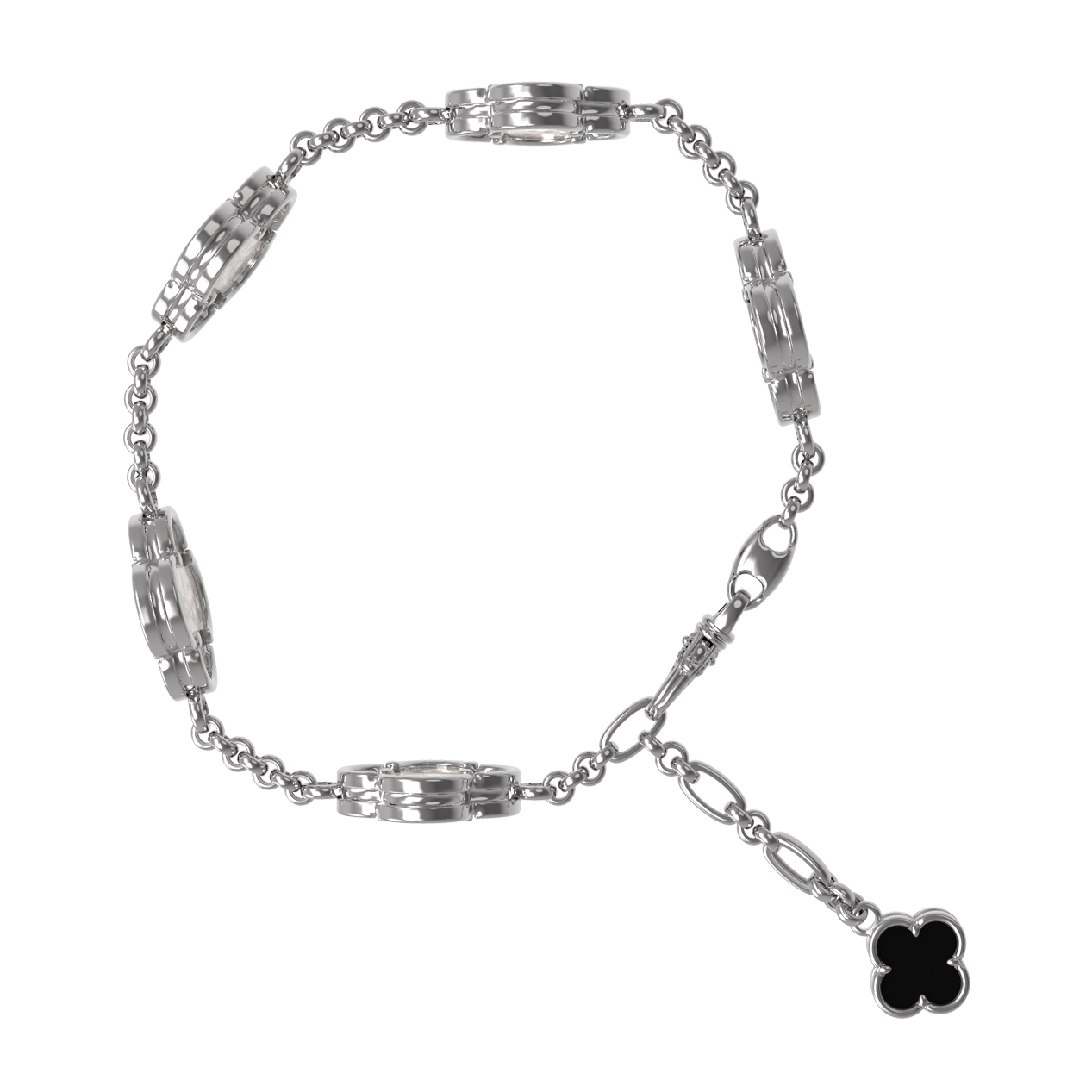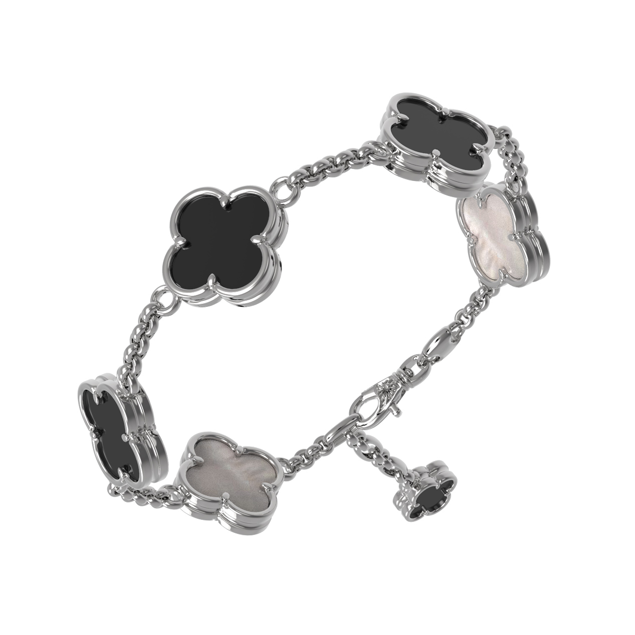 Благодаря классическому дизайну в виде клевера, данное изделие легко комбинируется с другими аксессуарами. Вы можете приобрести его отдельно или в дополнение к другим ювелирным украшениям, чтобы создать полноценный и гармоничный комплект. Ювелирное изделие из белого золота с ониксом и перламутром подчеркнет вашу индивидуальность, добавив акцент в повседневный или праздничный стиль.