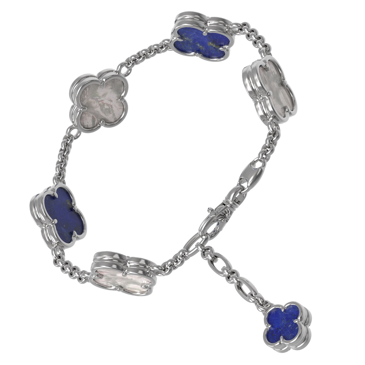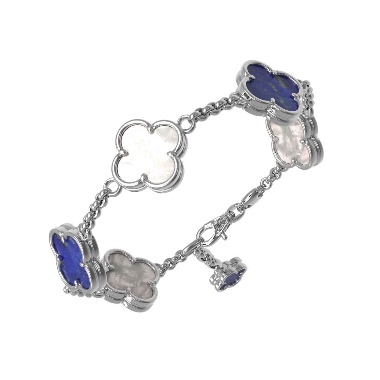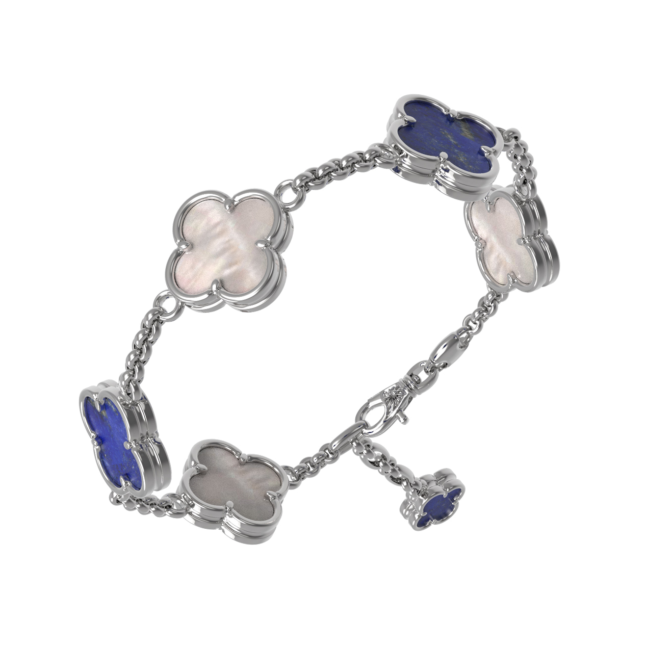 Ювелирное изделие украшают 3 вставки, среди которых нежный перламутр и насыщенный синий лазурит. Контрастное сочетание перламутровых и синих оттенков придает браслету особенную глубину и благородство. Каждая деталь подчеркивает высокое мастерство исполнения, делая это украшение универсальным аксессуаром.