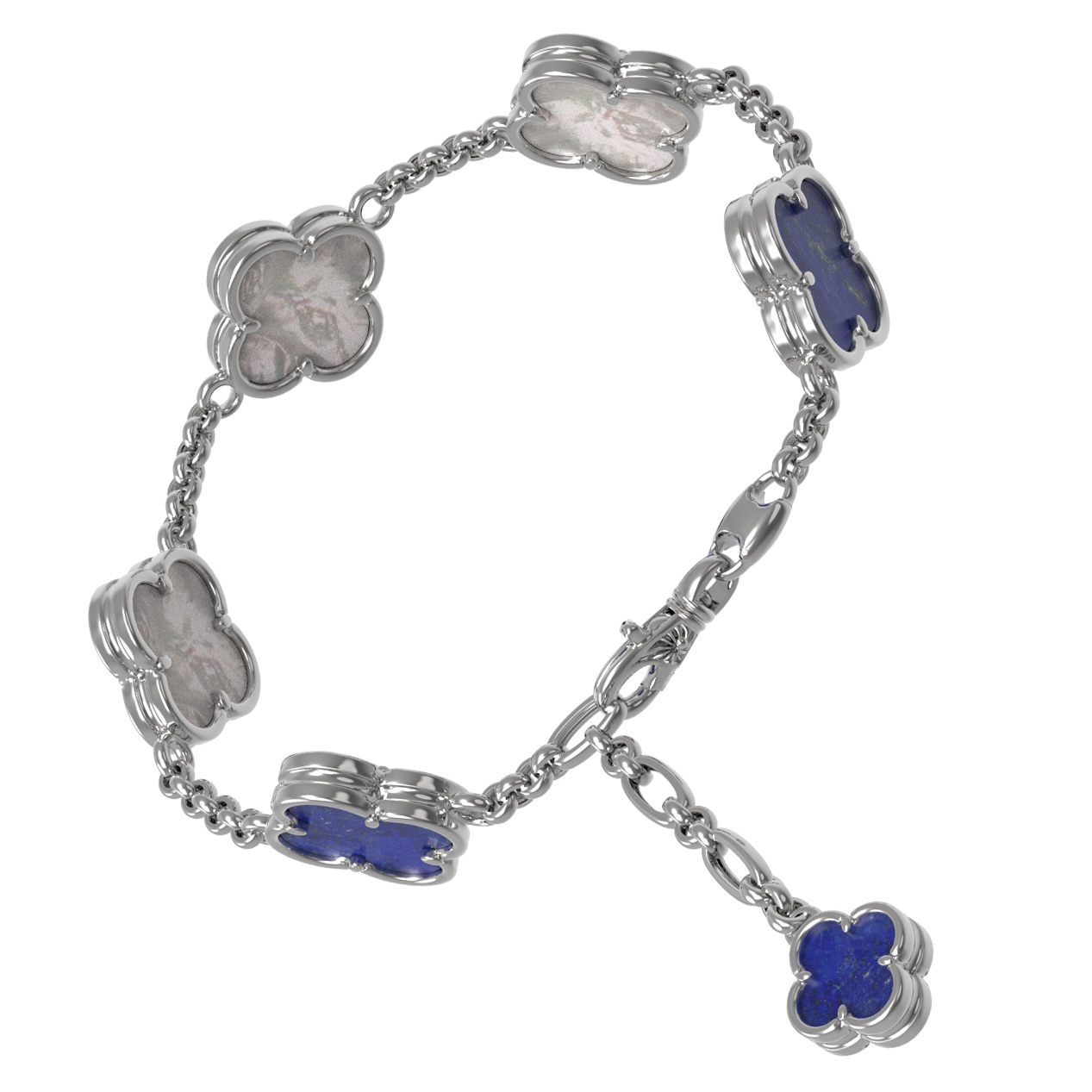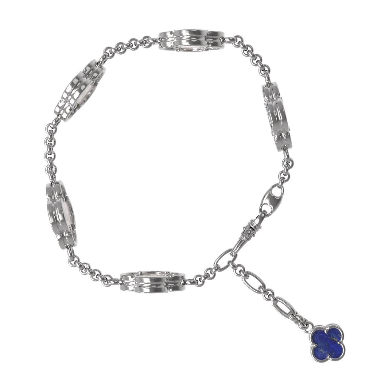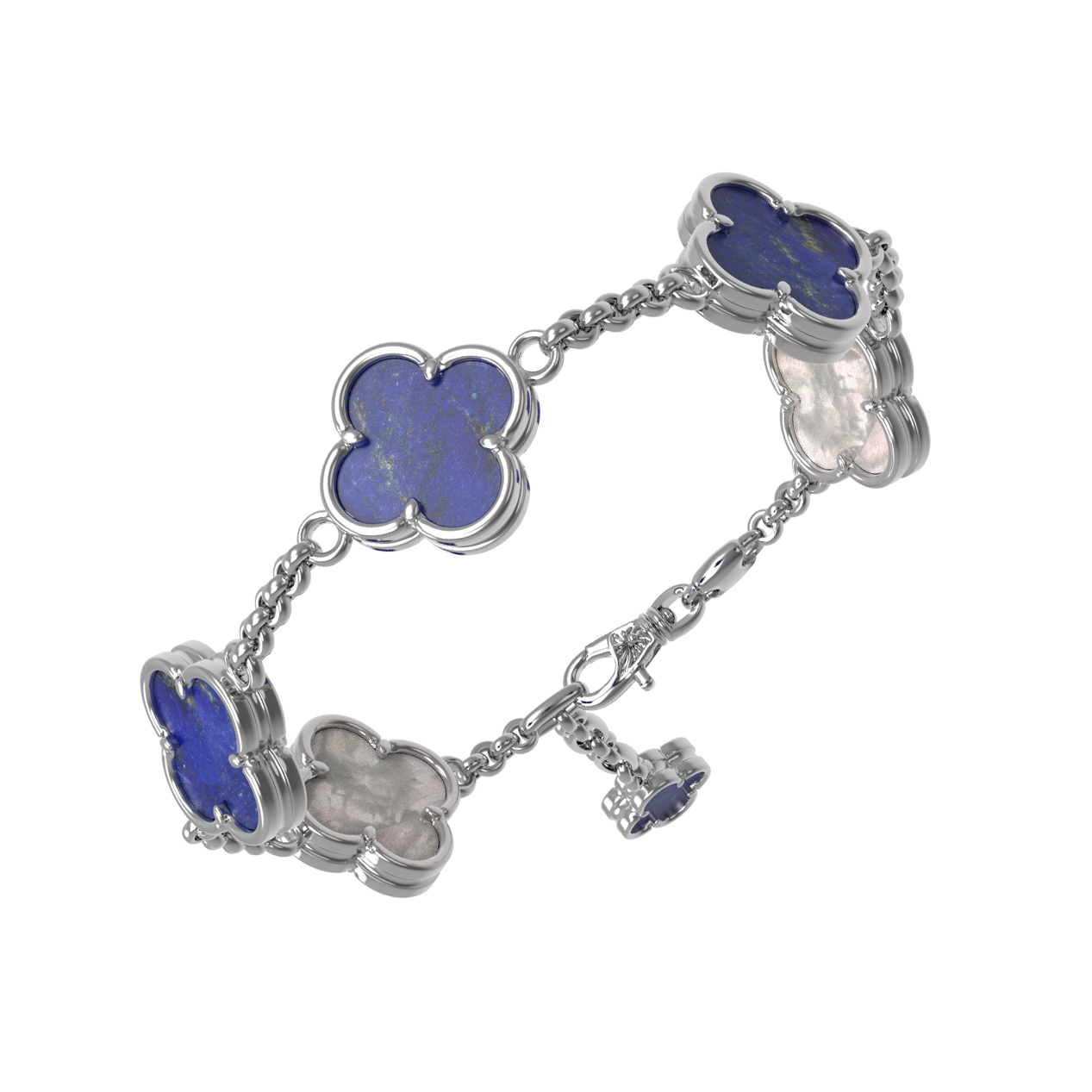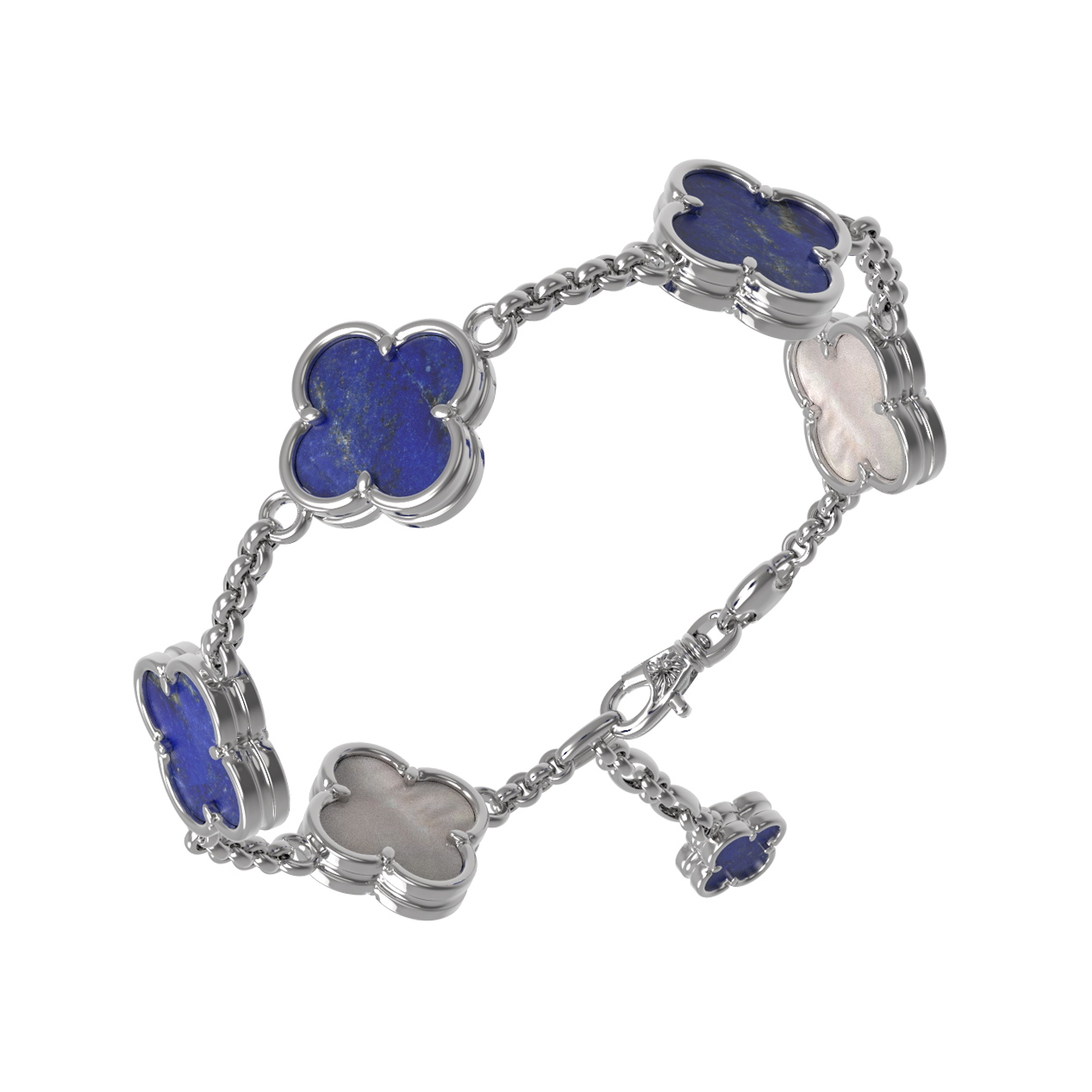 Изысканный браслет из белого золота 585 пробы из коллекции De Luxe — Клевер весна станет безупречным акцентом вашего образа. Дизайн изделия выполнен в виде узнаваемых символов клевера, которые олицетворяют удачу и гармонию. Благородный блеск белого металла великолепно сочетается с глубоким синим оттенком натурального лазурита и нежным сиянием перламутра. Гармоничное чередование этих вставок создает стильную игру контрастов, придавая украшению особое очарование.