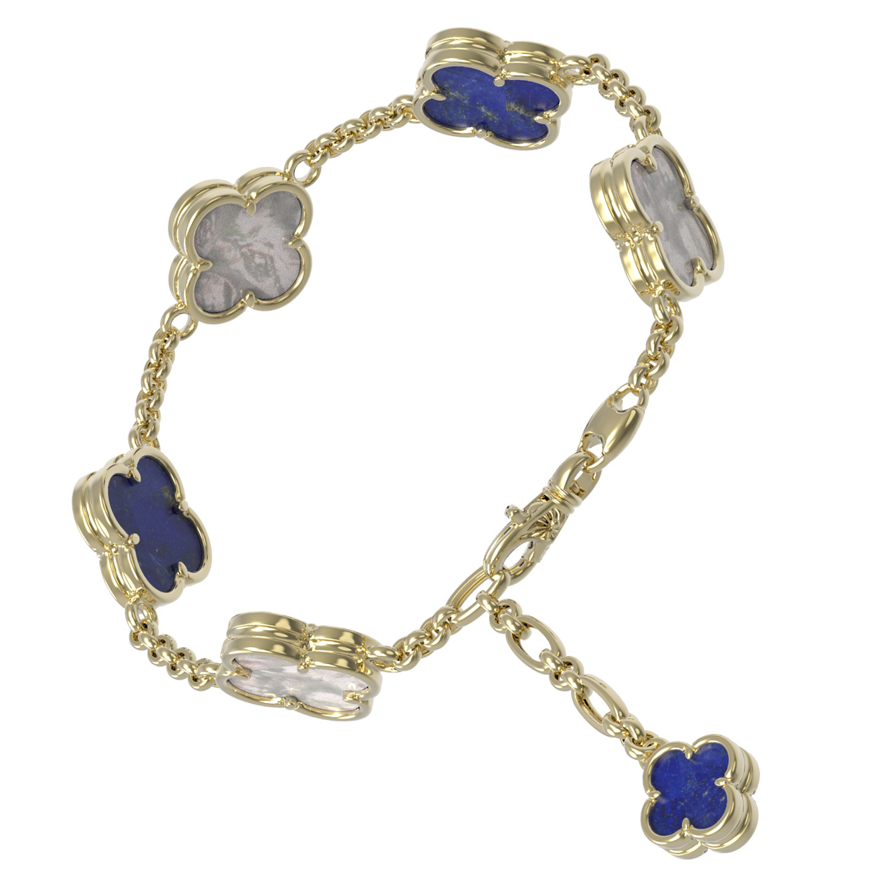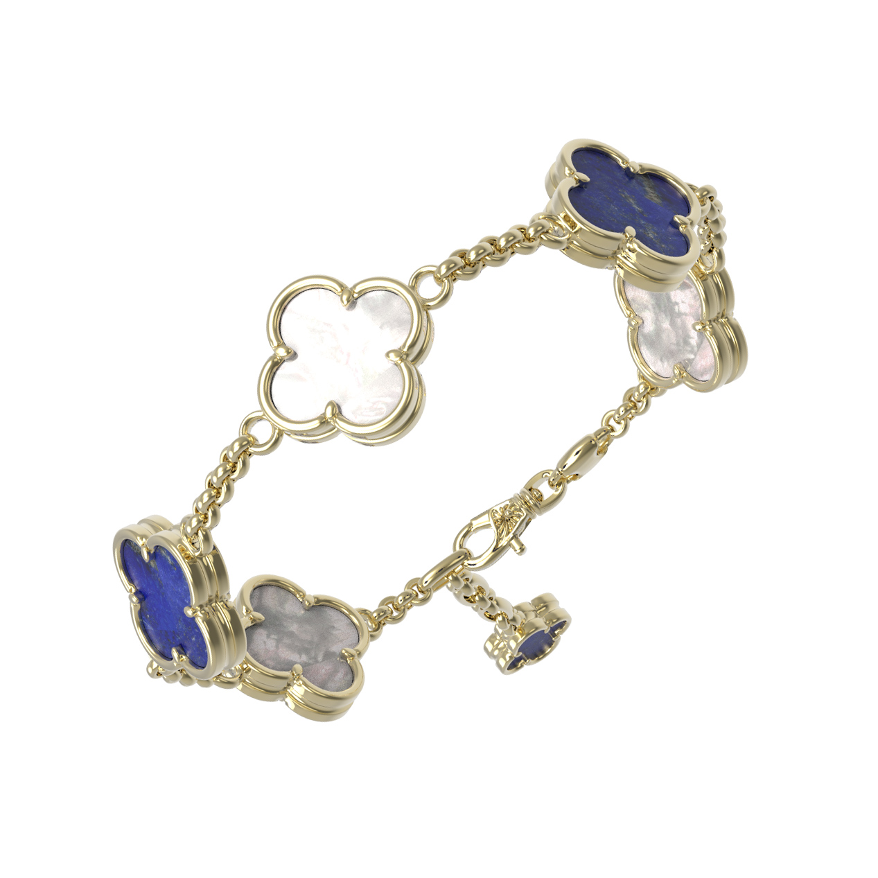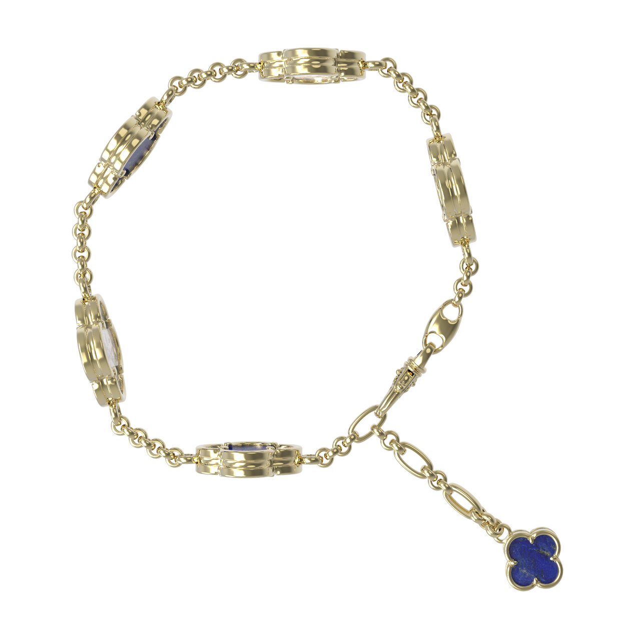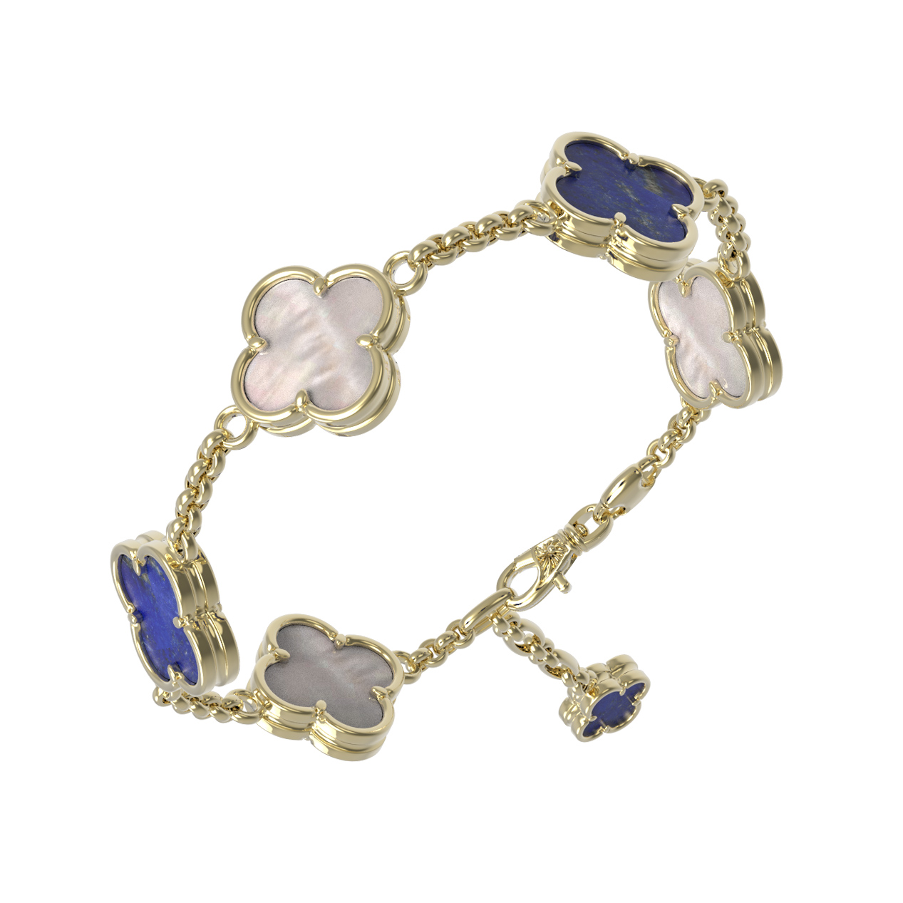 Элегантный браслет из лимонного золота 585 пробы станет изысканным акцентом вашего образа. Дизайн украшения, вдохновленный нежным мотивом клевера, придает изделию особое очарование и символизирует гармонию. В оформлении аксессуара гармонично сочетаются три вставки: глубокий синий лазурит и нежный перламутр, которые создают благородный контраст с теплым оттенком драгоценного металла.