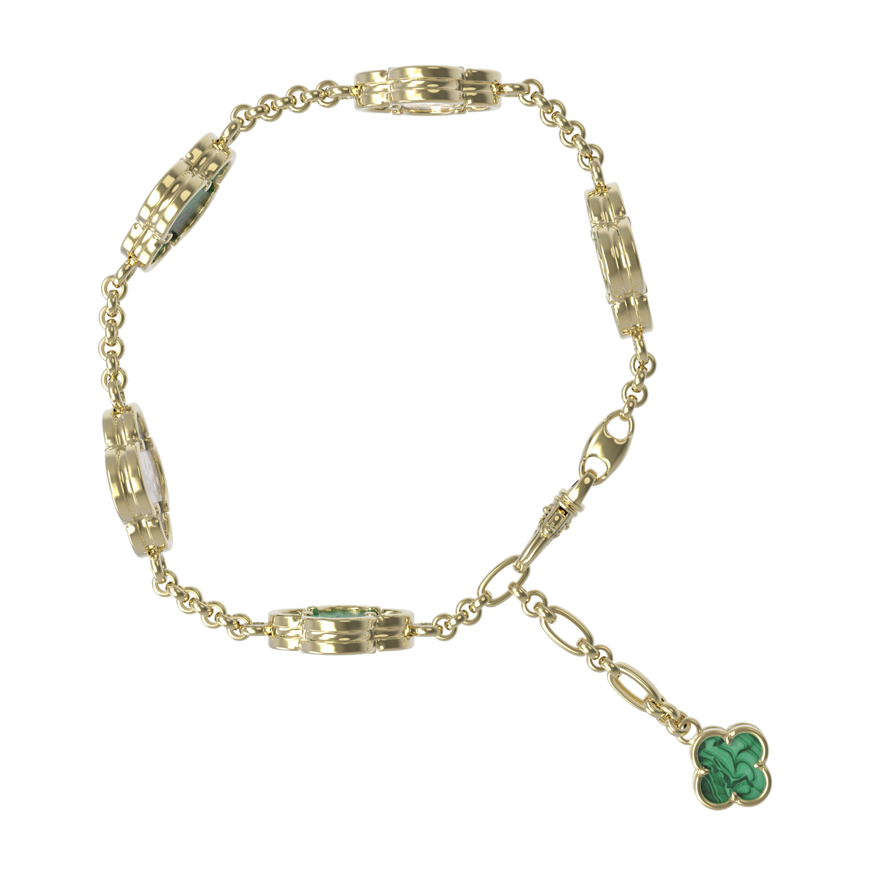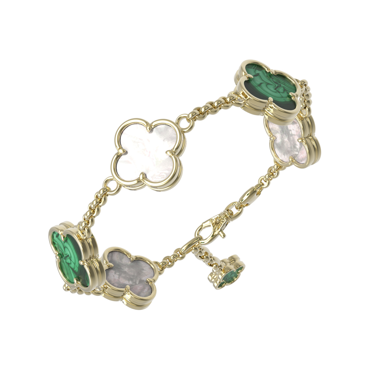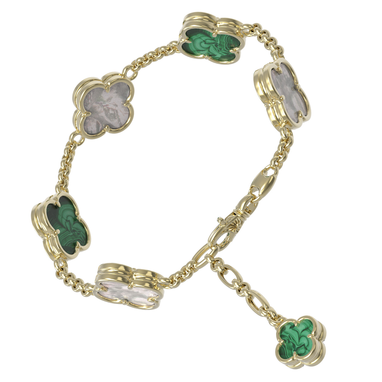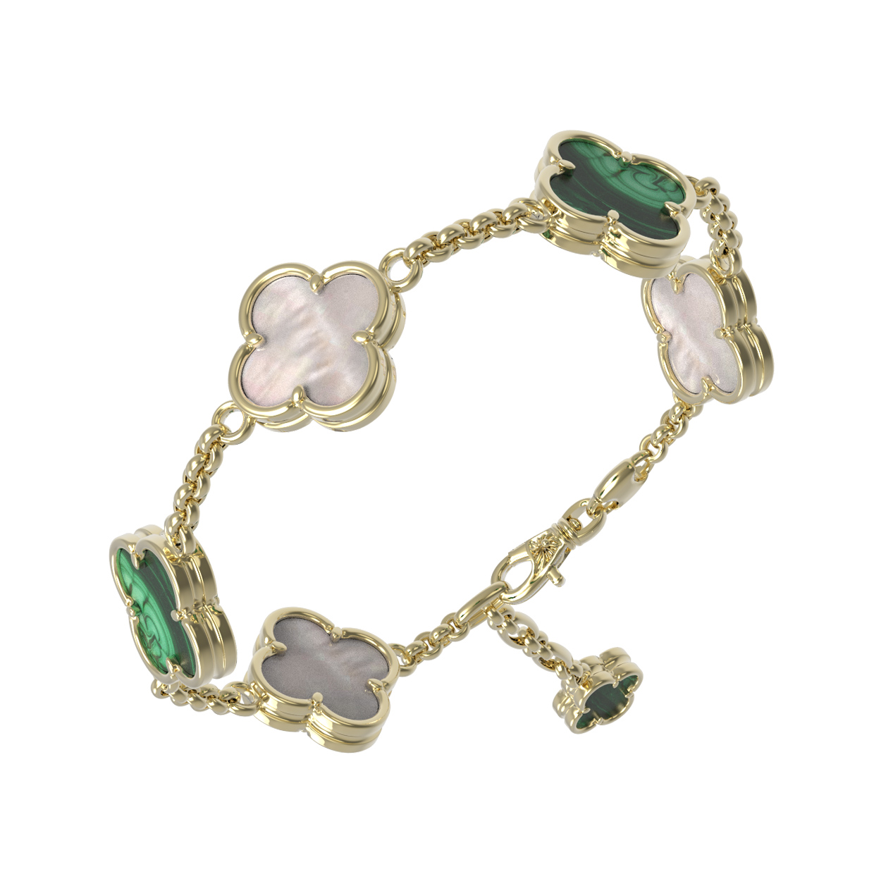 Элегантный браслет из лимонного золота 585 пробы — это воплощение утонченности и природной красоты. Дизайн изделия, вдохновленный символом клевера, придает украшению особый шарм и делает его универсальным дополнением к любому образу. Линии металла нежного лимонного оттенка гармонично сочетаются с природными вставками: глубоким зеленым малахитом и переливающимся перламутром. Контраст этих материалов создает выразительную игру цвета, которая привлекает внимание и подчеркивает безупречный вкус владельца.
