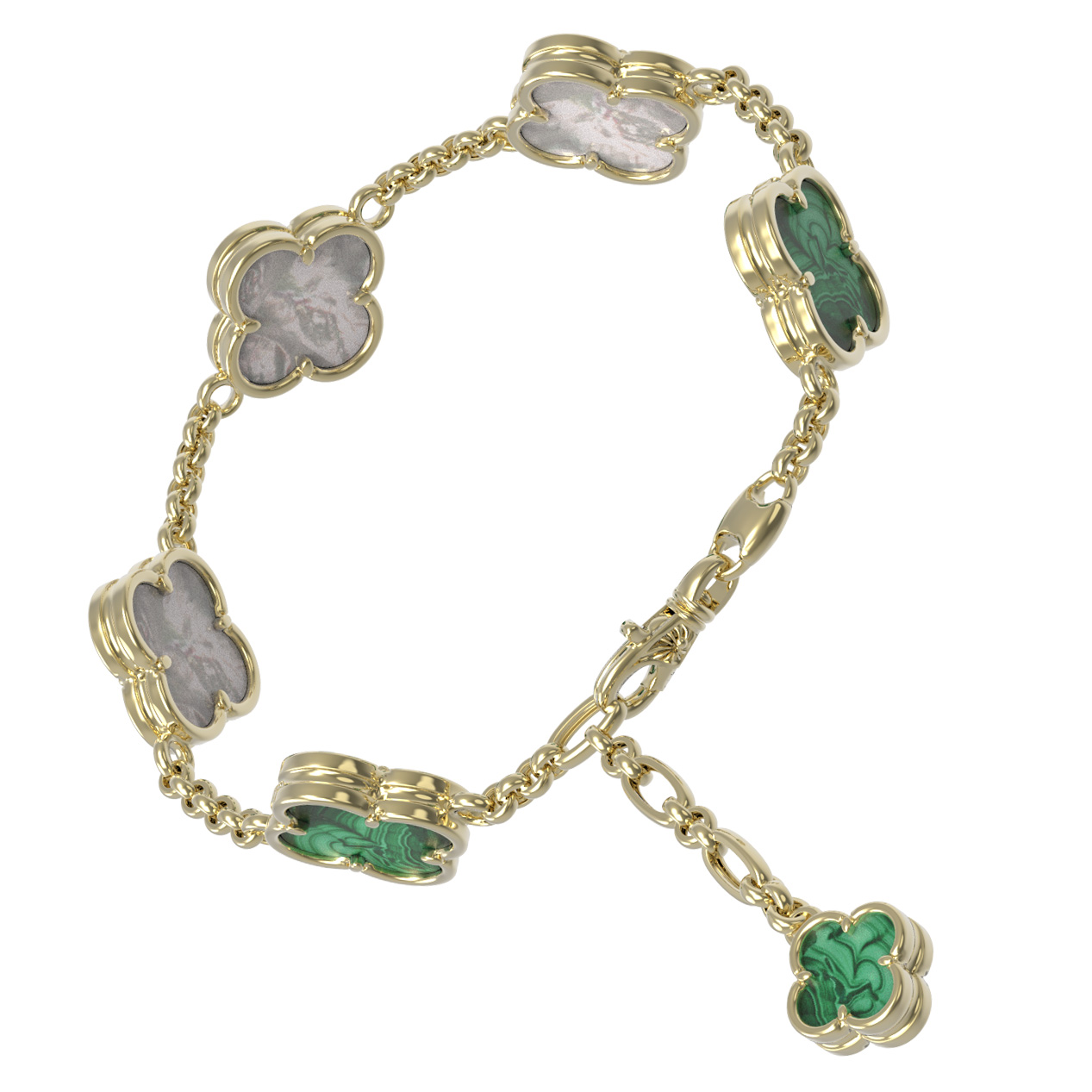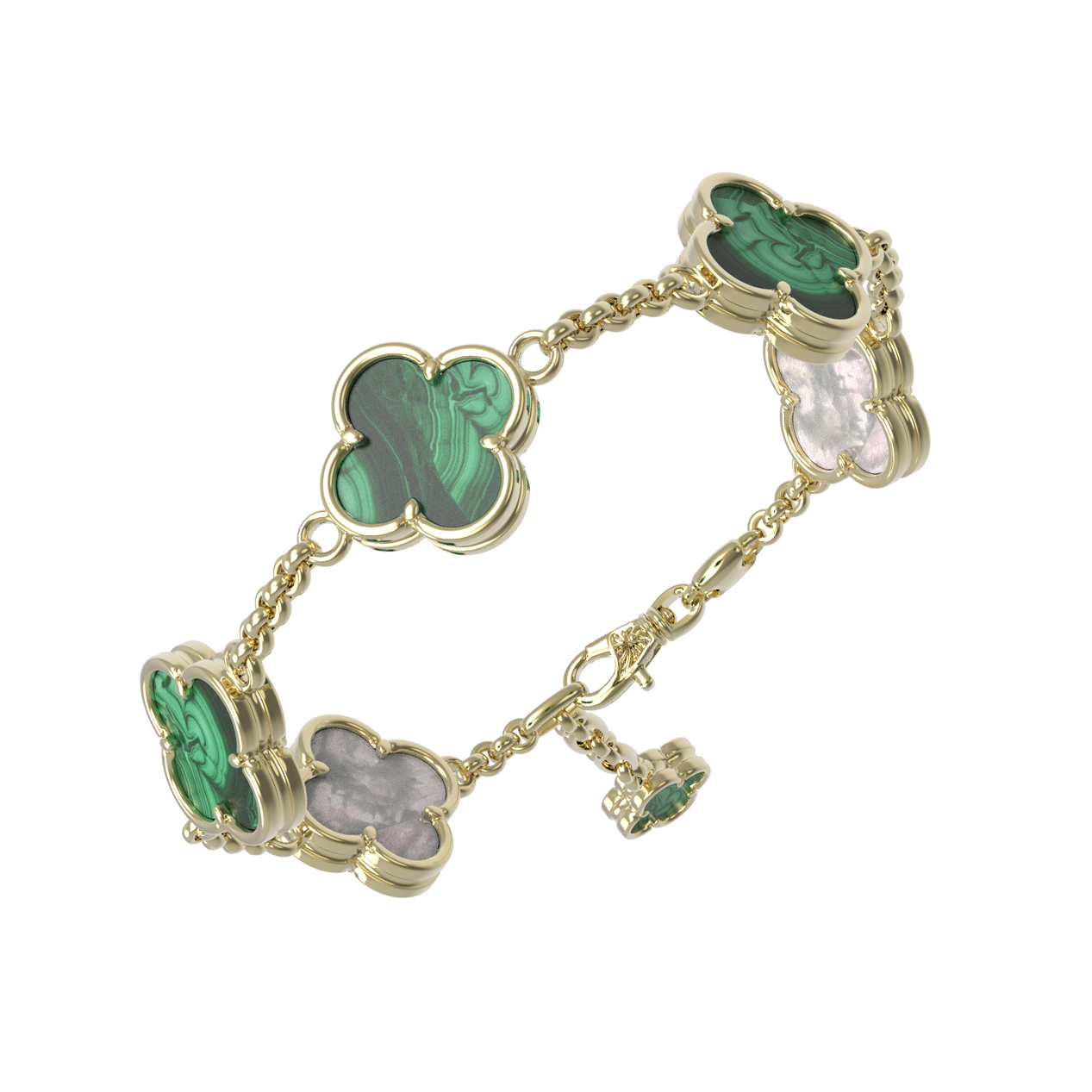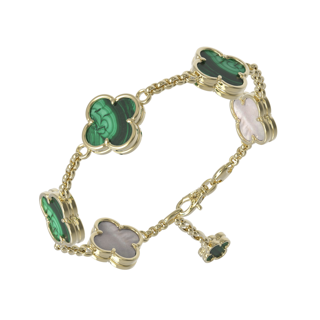 Мастерство исполнения проявляется в каждой детали: яркие зеленые вставки из природного малахита перекликаются с нежным сиянием перламутра, создавая эффектный контраст. Всего в браслете использовано 6 вставок, каждая из которых бережно закреплена в лимонном золоте. Благородный оттенок металла идеально подчеркивает глубину зеленого малахита и мягкий блеск перламутра, придавая изделию особую выразительность.
