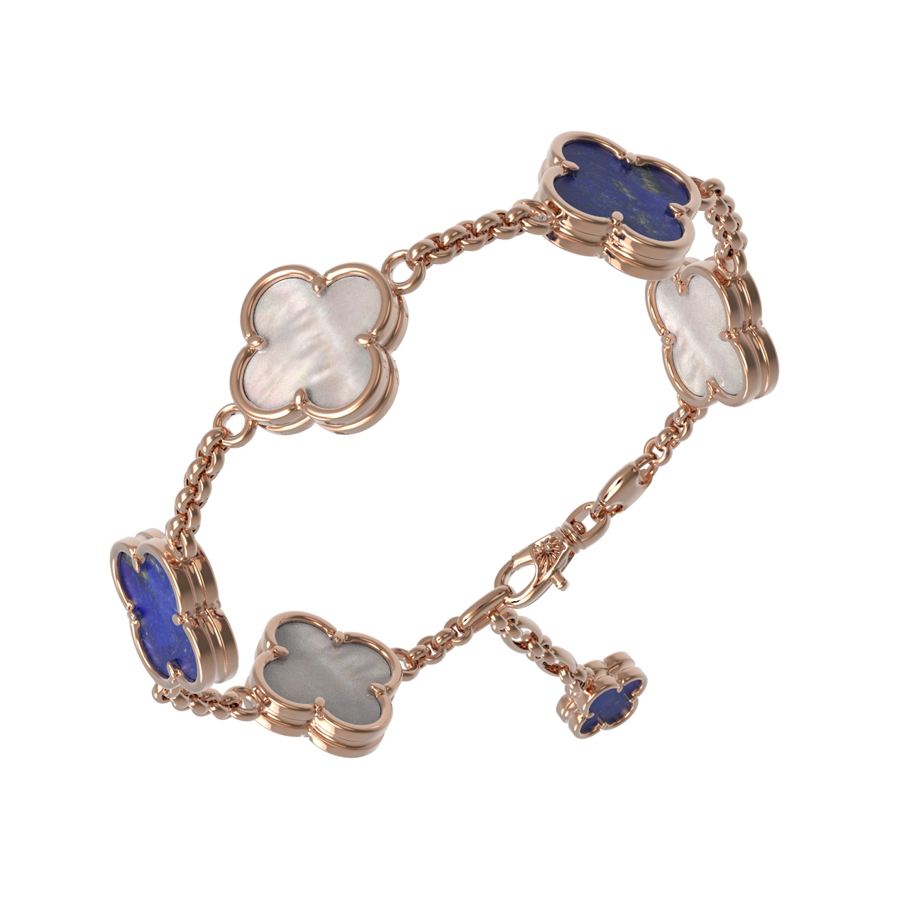 Изящный браслет из красного золота 585 пробы из коллекции De Luxe — Клевер весна станет утонченным акцентом вашего образа. Дизайн изделия выполнен в популярной тематике клевер, которая символизирует удачу и гармонию. Ювелирная композиция объединяет благородный металл и природные минералы: эффектные вставки из лазурита синего цвета гармонично сочетаются с нежным перламутром. Всего в модели предусмотрено 3 выразительные вставки, которые приковывают взгляд своим контрастным и в то же время сбалансированным оформлением.