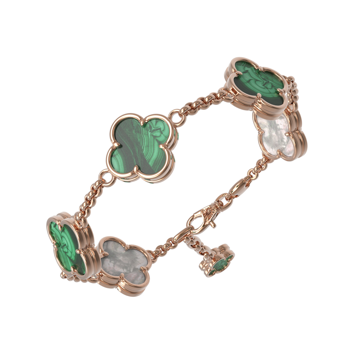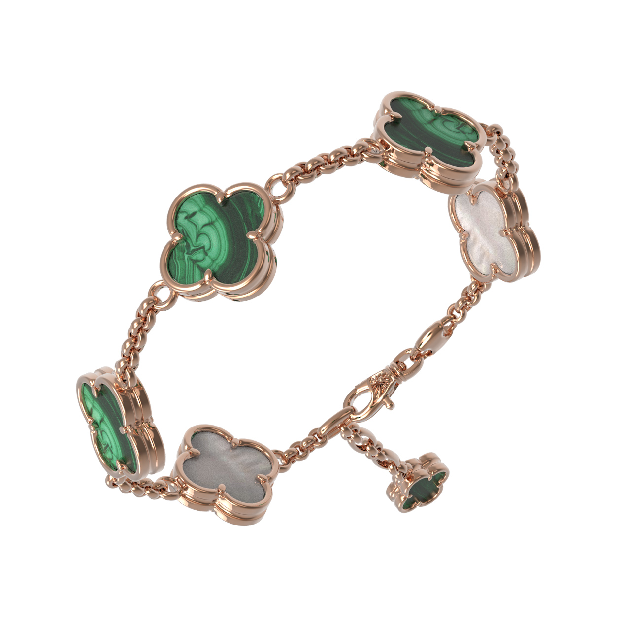 Изысканный браслет из коллекции De Luxe — Клевер весна станет безупречным акцентом вашего образа, подчеркивая утонченный вкус и статус. Это ювелирное украшение выполнено из красного золота 585 пробы, чей теплый оттенок гармонично сочетается с природной красотой камней. Дизайн модели вдохновлен эстетикой клевера — символа удачи и гармонии, который обрел воплощение в шести элегантных вставках.