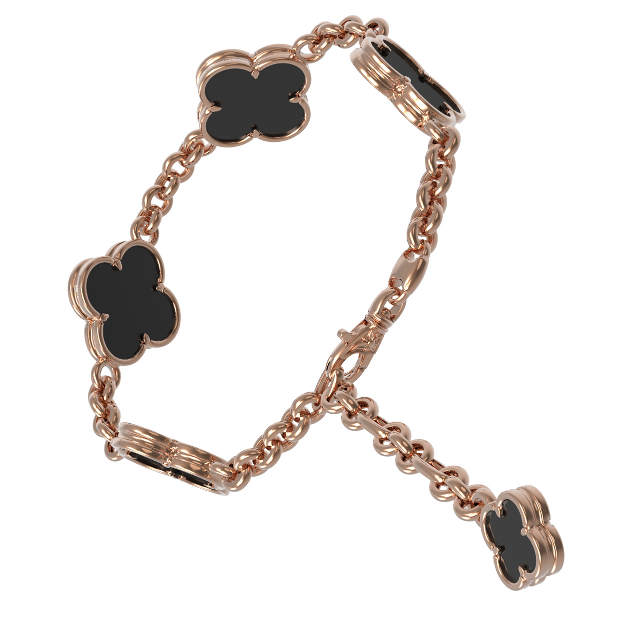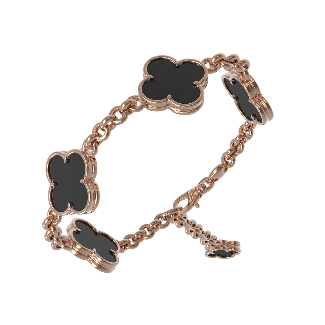 Центральными элементами композиции являются 5 вставок из натурального оникса глубокого черного цвета. Контрастное сочетание теплого красного золота и темного минерала создает выразительный визуальный эффект, подчеркивающий статусность украшения. Качественная проработка деталей и надежное крепление вставок гарантируют долговечность и комфорт при повседневном ношении.
