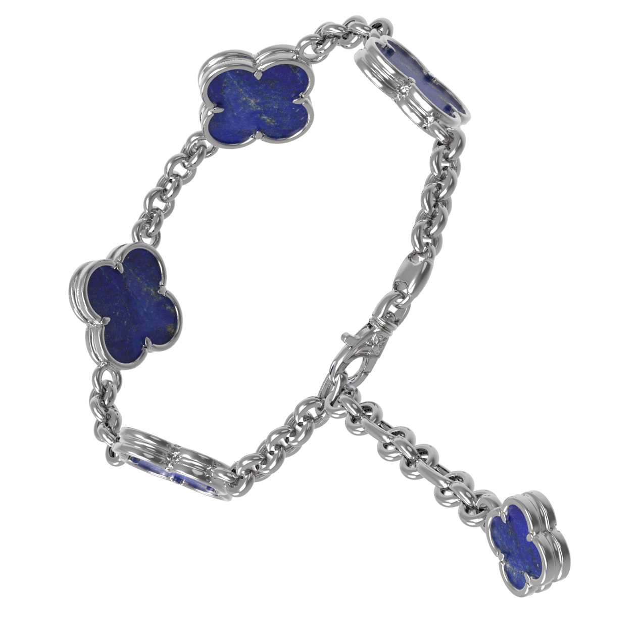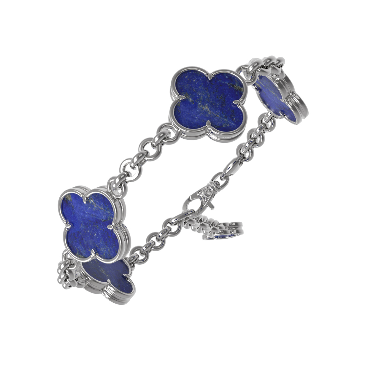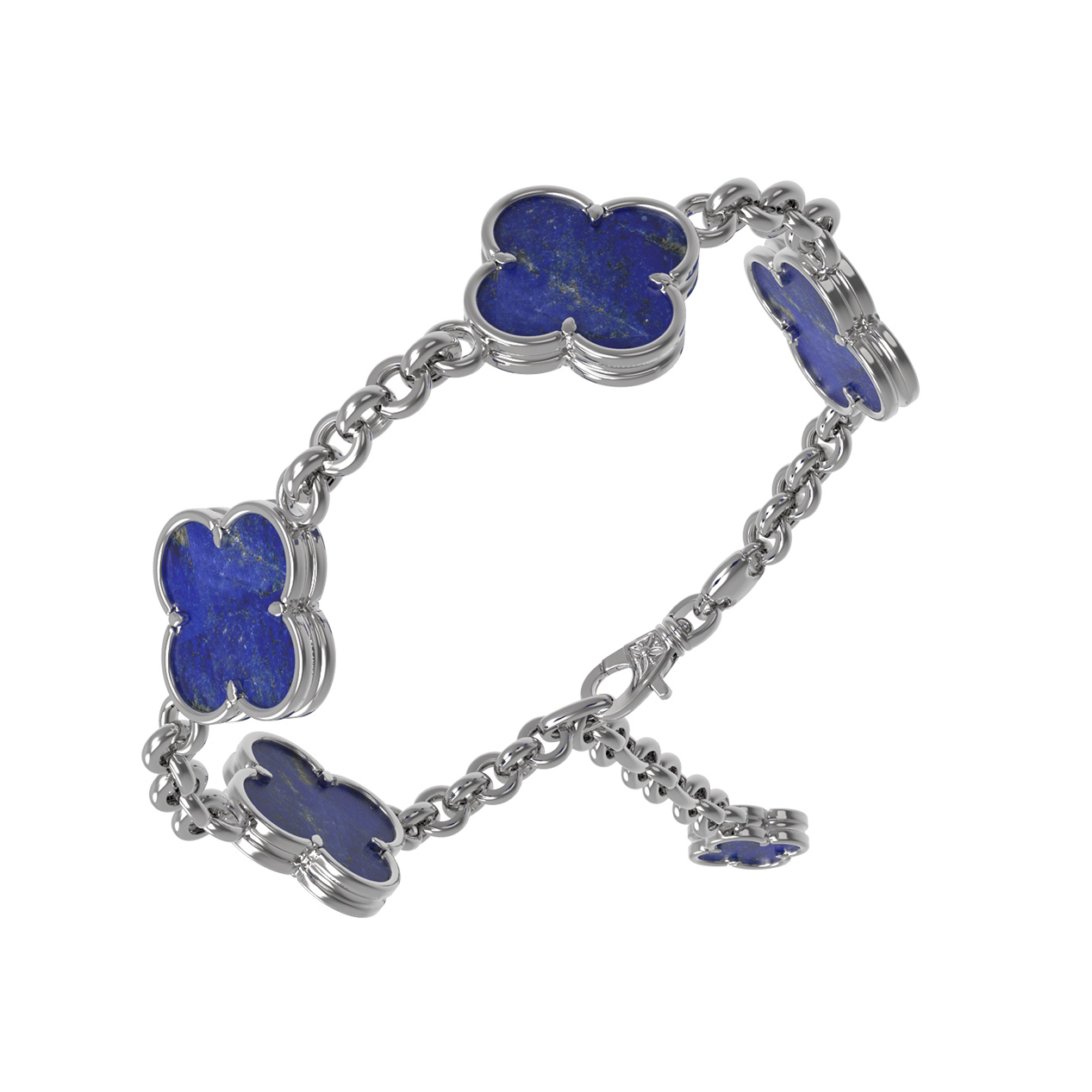 Центральными элементами украшения выступают 5 вставок из глубокого синего лазурита. Насыщенный цвет камня эффектно контрастирует с холодным блеском белого золота, создавая благородное и выразительное сочетание. Надежная цепочка подчеркивает изящество линий, а лаконичная форма вставок делает этот браслет универсальным аксессуаром.