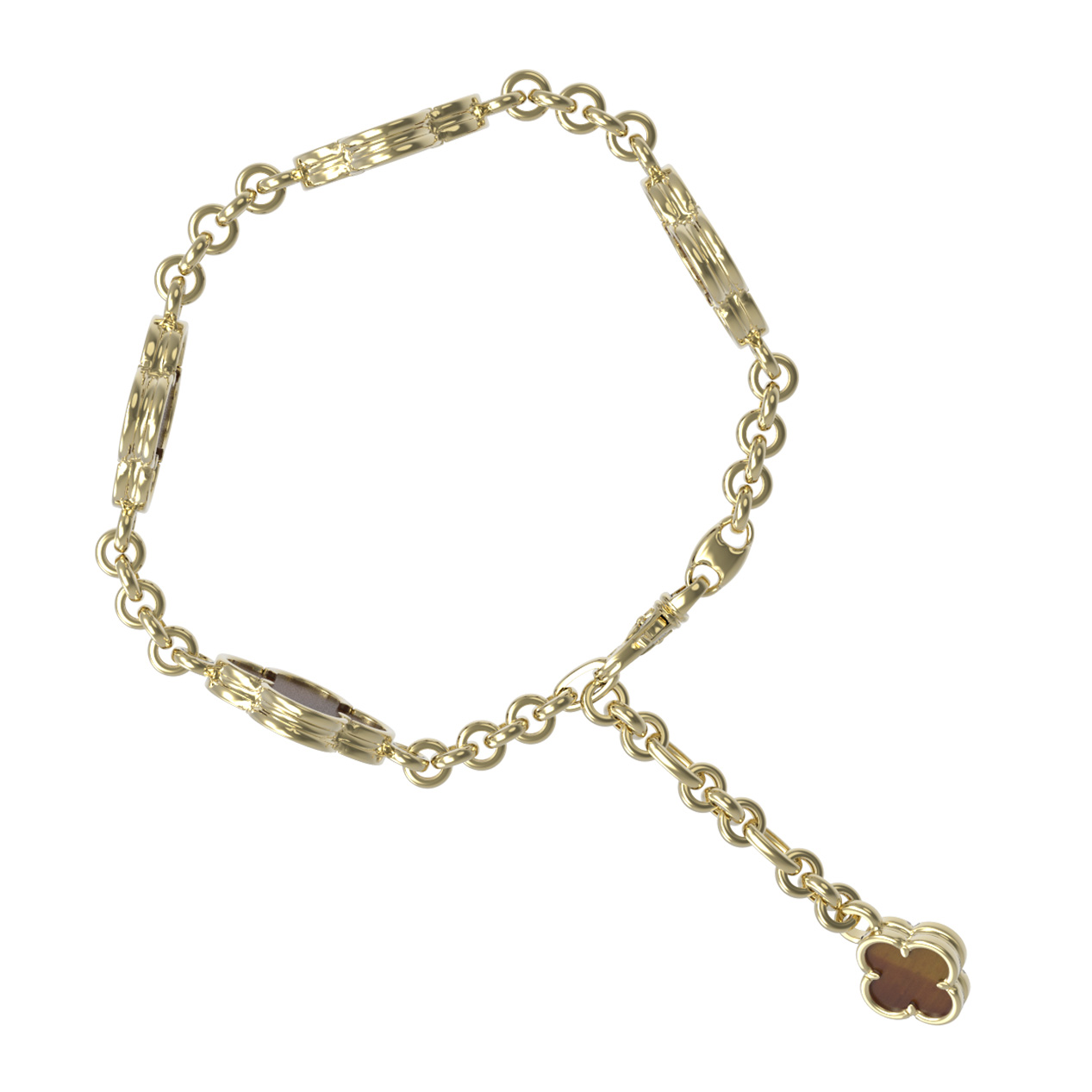 Центральным элементом композиции являются пять вставок из натурального тигрового глаза. Этот камень насыщенного оранжевого цвета с уникальным шелковистым отливом эффектно контрастирует с теплым сиянием драгоценного металла. Качественная обработка вставок позволяет камню раскрыть всю глубину природного рисунка. Гибкая цепочка из лимонного золота обеспечивает комфортную посадку на запястье, а надежный замок гарантирует безопасность при ежедневной носке.