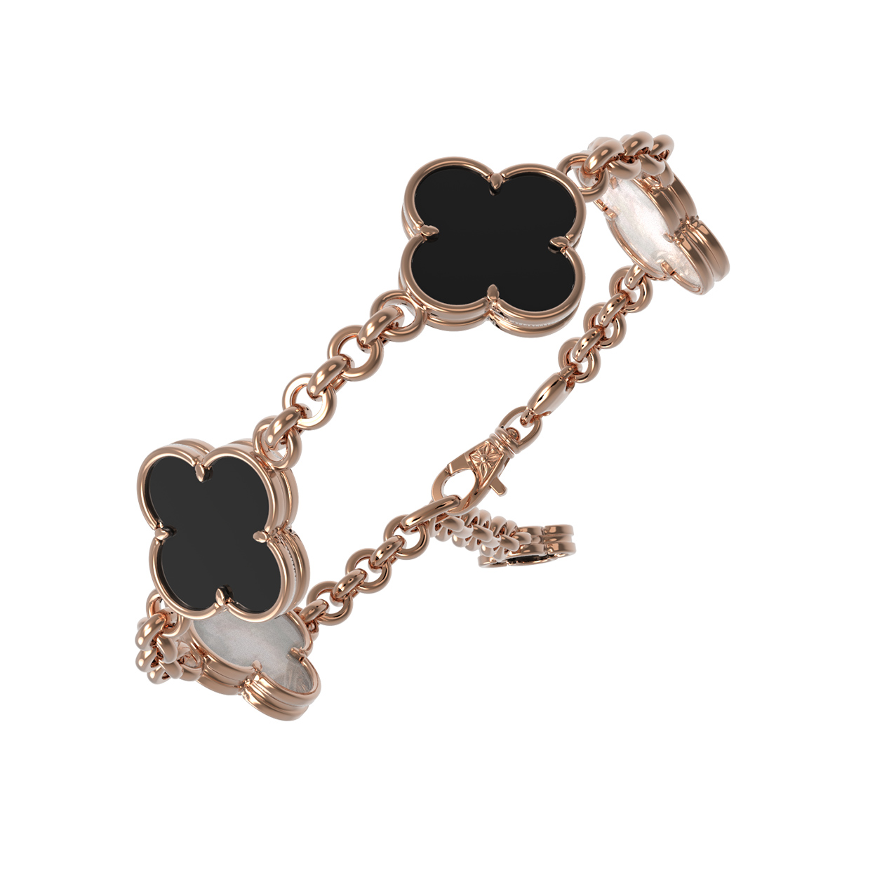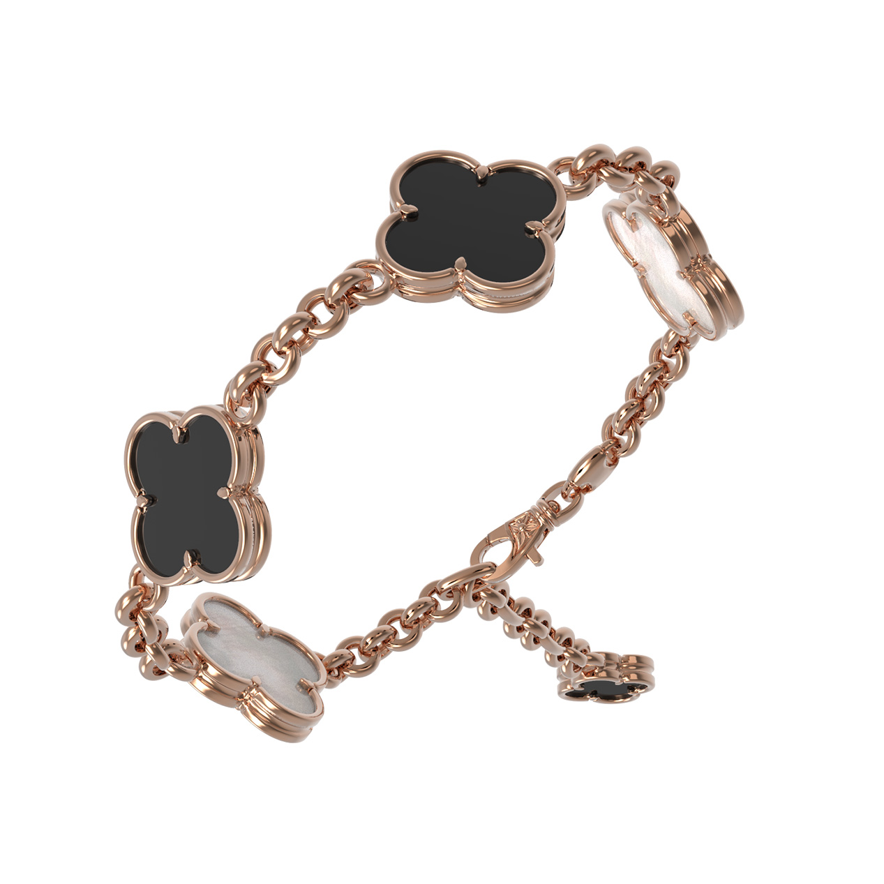 Центральным элементом украшения выступают пять вставок, чередующих глубокий черный оникс и нежный перламутр. Такое контрастное сочетание вставок делает браслет универсальным аксессуаром, который легко адаптируется к любому стилю одежды. Теплый оттенок красного золота красиво оттеняет природную красоту камней, создавая благородное сияние на запястье.