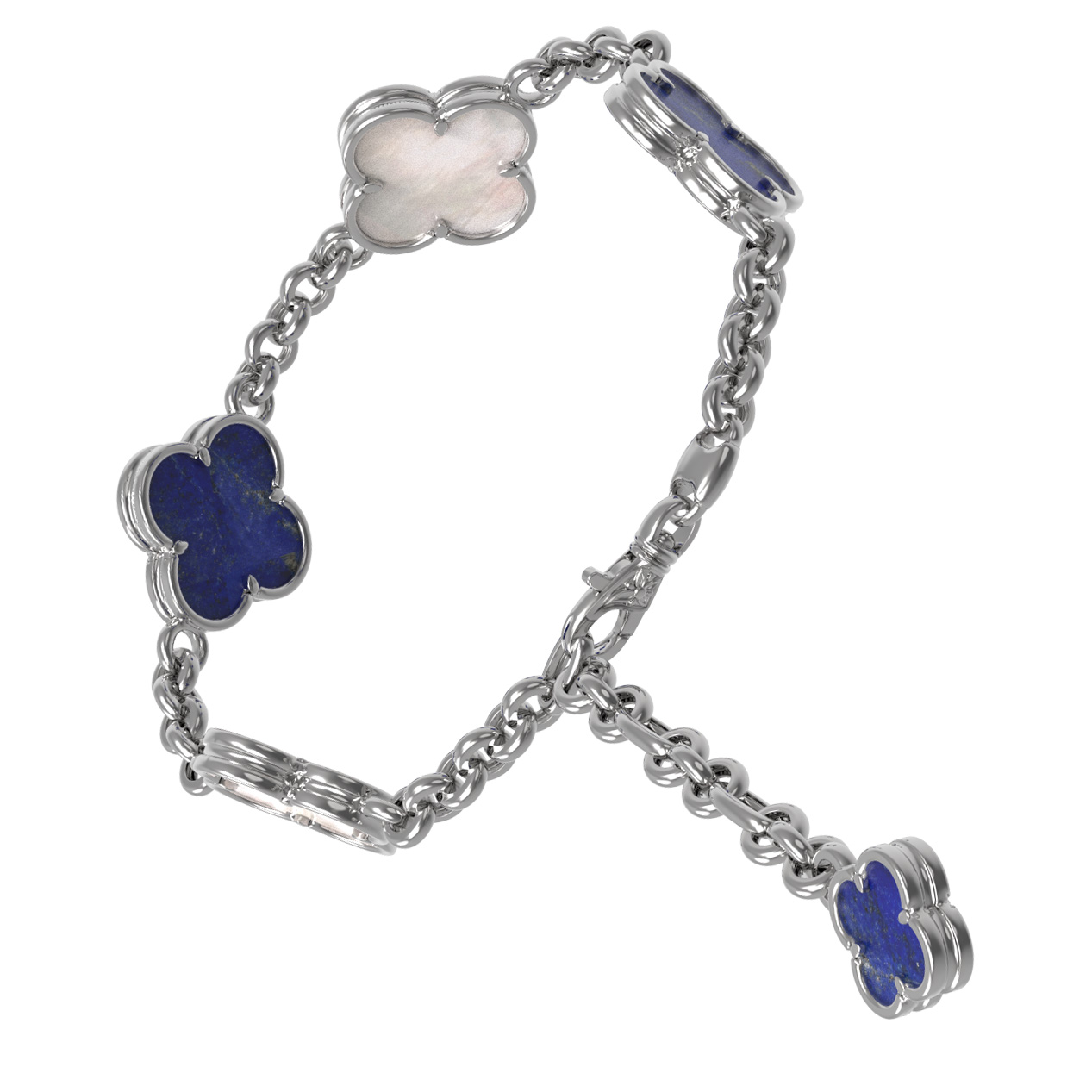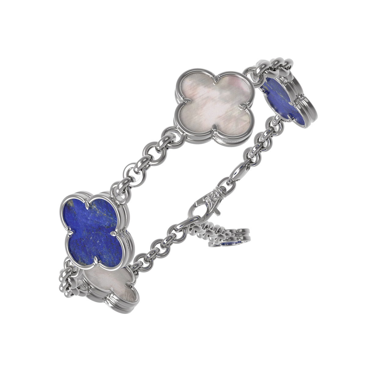 Элегантный браслет из коллекции De Luxe — Клевер весна станет безупречным акцентом вашего образа, подчеркивая утонченный вкус и внимание к деталям. Это ювелирное изделие, выполненное из белого золота 585 пробы, обладает холодным благородным блеском, который гармонично сочетается с выразительными вставками. Дизайн украшения строится вокруг узнаваемого символа клевера, придающего аксессуару нотки природной эстетики и легкости.