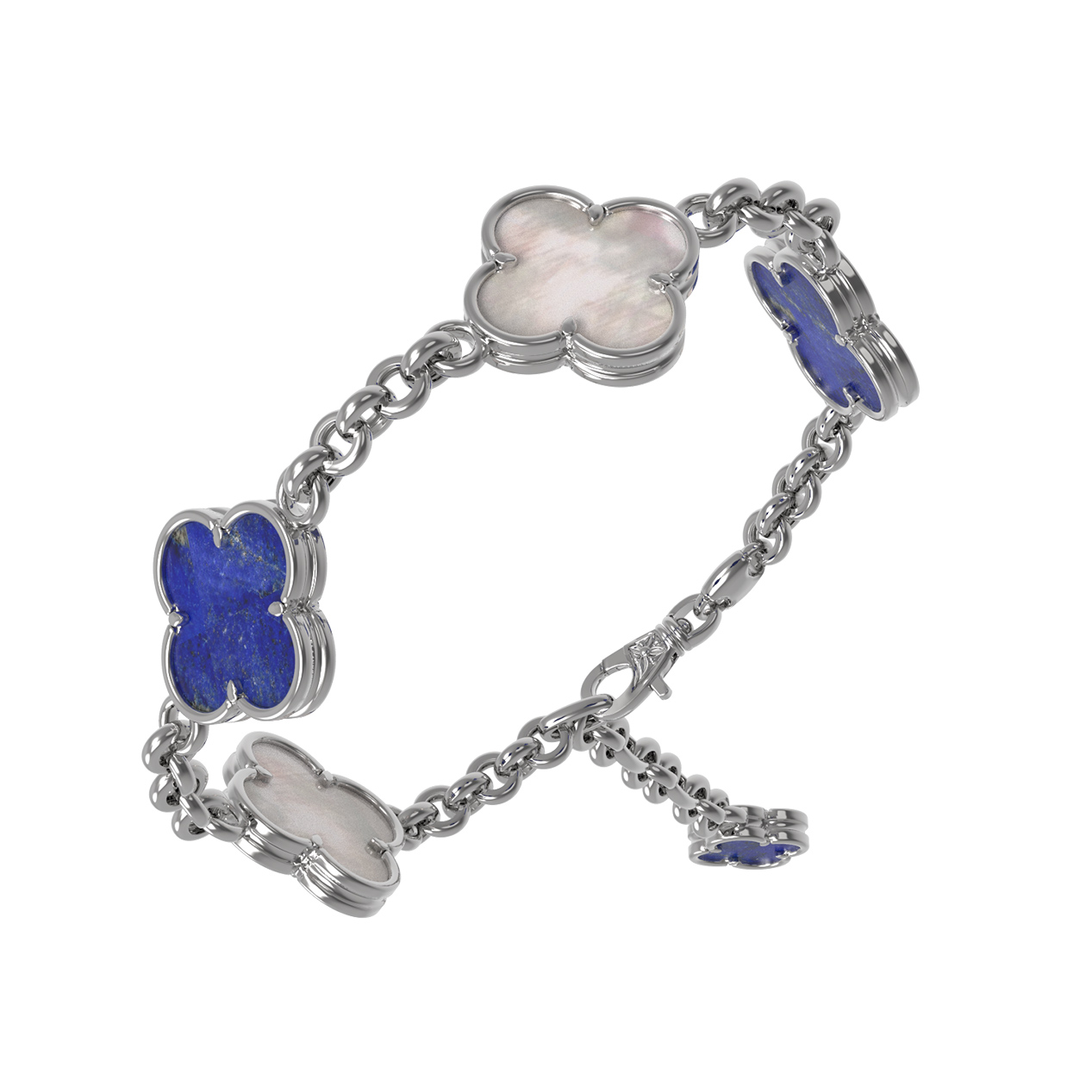 В центре композиции — 3 вставки, в которых глубокий синий цвет лазурита чередуется с нежным переливом перламутра. Контрастное сочетание синего и перламутрового оттенков создает эффектную игру света, привлекая внимание к запястью. Продуманная конструкция и качественное исполнение делают этот браслет универсальным украшением, которое подходит как для женщин, так и для мужчин.