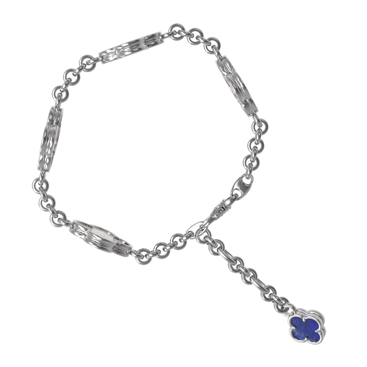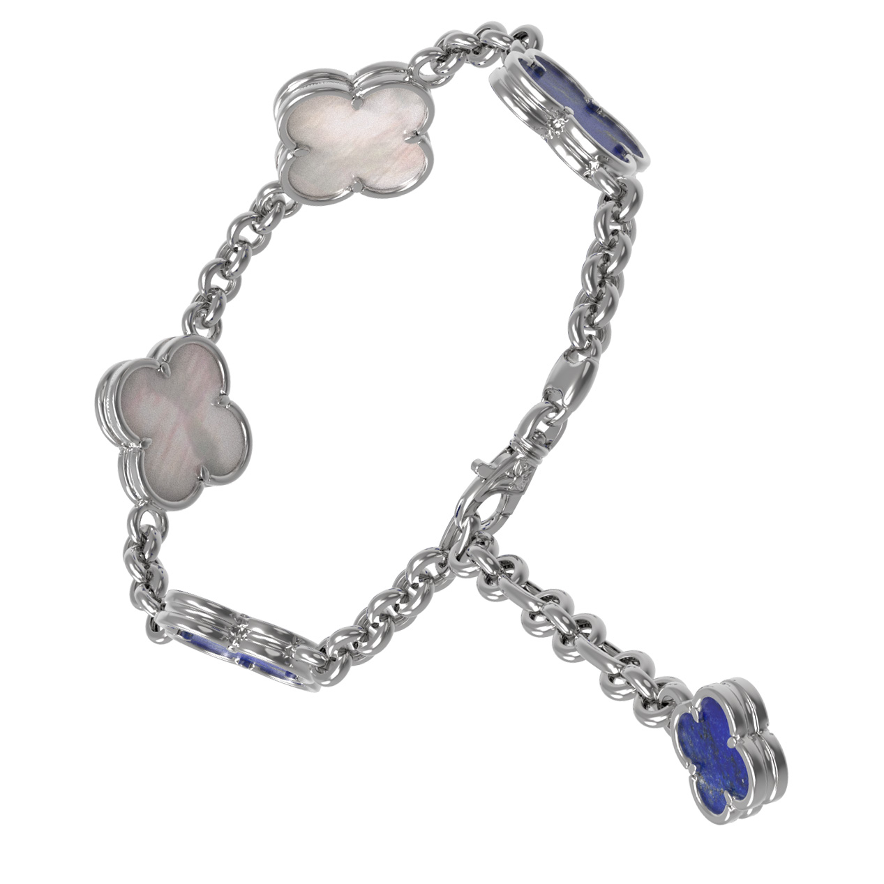 Изысканный браслет из белого золота 585 пробы из коллекции De Luxe — Клевер весна станет воплощением утонченного вкуса и символом удачи. В дизайне изделия мастерски обыграна популярная форма клевера, которая придает украшению особый шарм и узнаваемость. В качестве вставок использованы пять элементов, гармонично сочетающих в себе благородный лазурит насыщенного синего цвета и нежный перламутр с его мягким переливом.