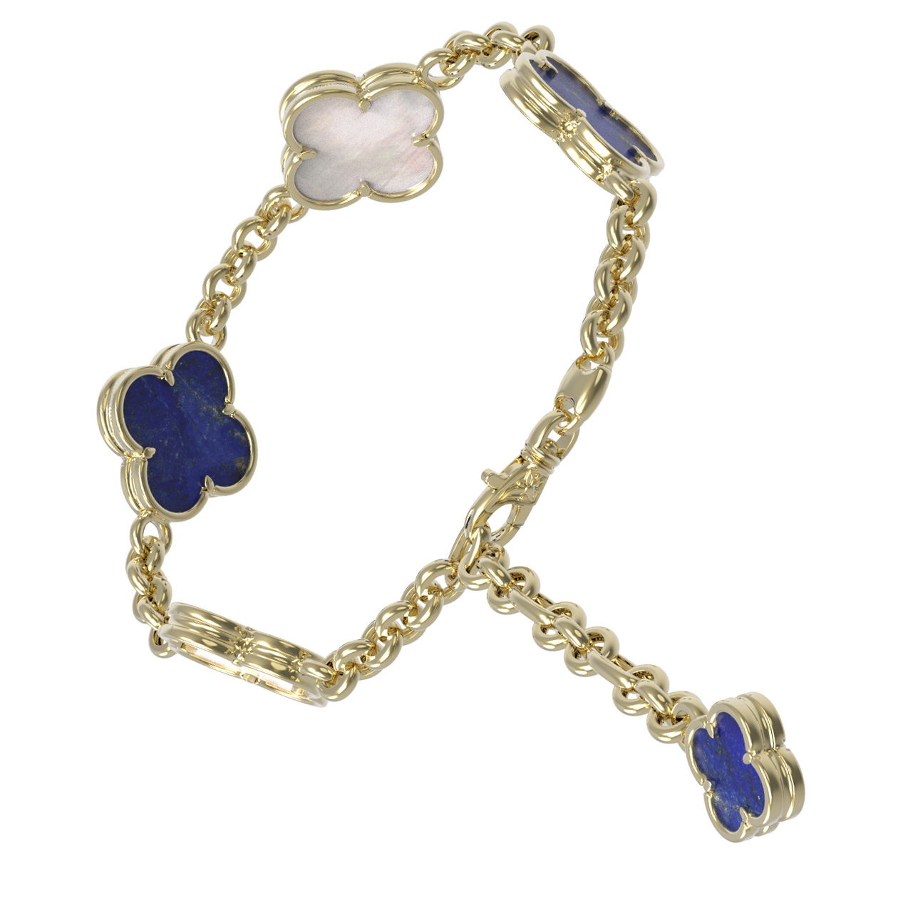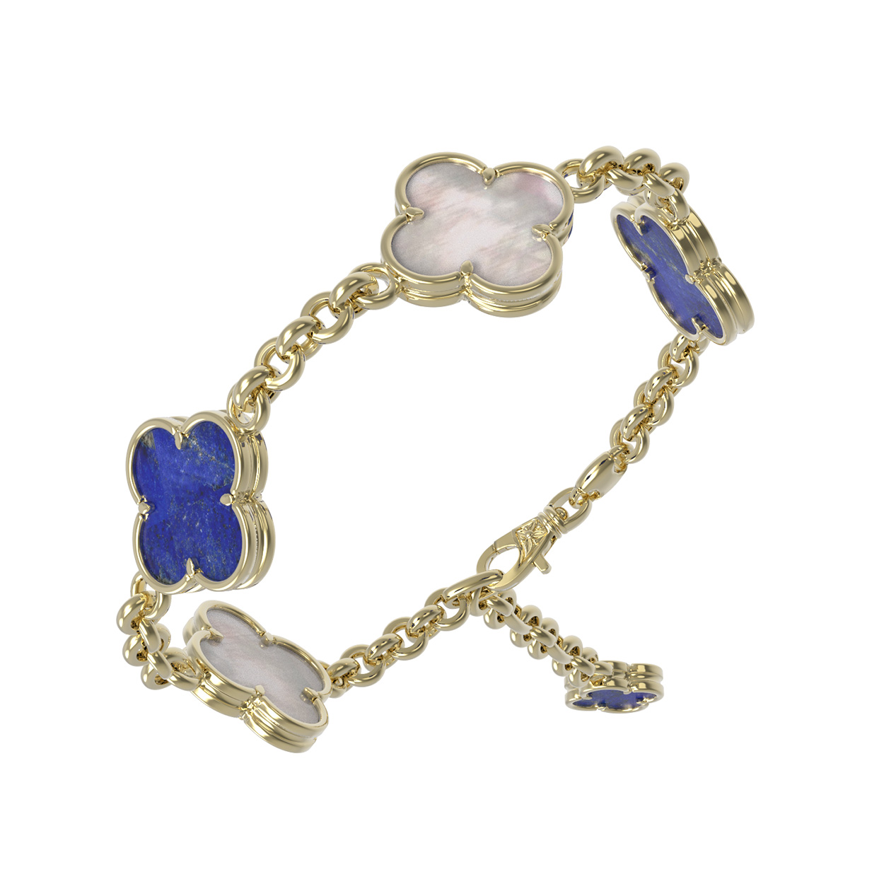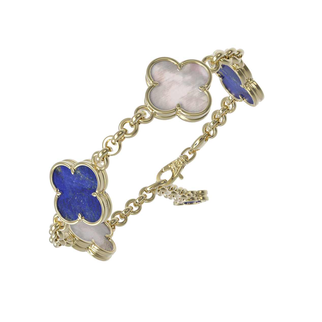 Изысканный браслет из коллекции De Luxe — Клевер весна станет воплощением вашего утонченного вкуса и любви к гармоничным аксессуарам. Это ювелирное украшение выполнено из лимонного золота 585 пробы, чей мягкий и солнечный оттенок идеально подчеркивает красоту натуральных вставок. Центральным элементом композиции выступает знаменитый дизайн клевер, символизирующий удачу и благополучие. В изделии гармонично сочетаются три вставки: глубокий синий лазурит и нежный перламутр, создавая контрастный и притягательный образ.