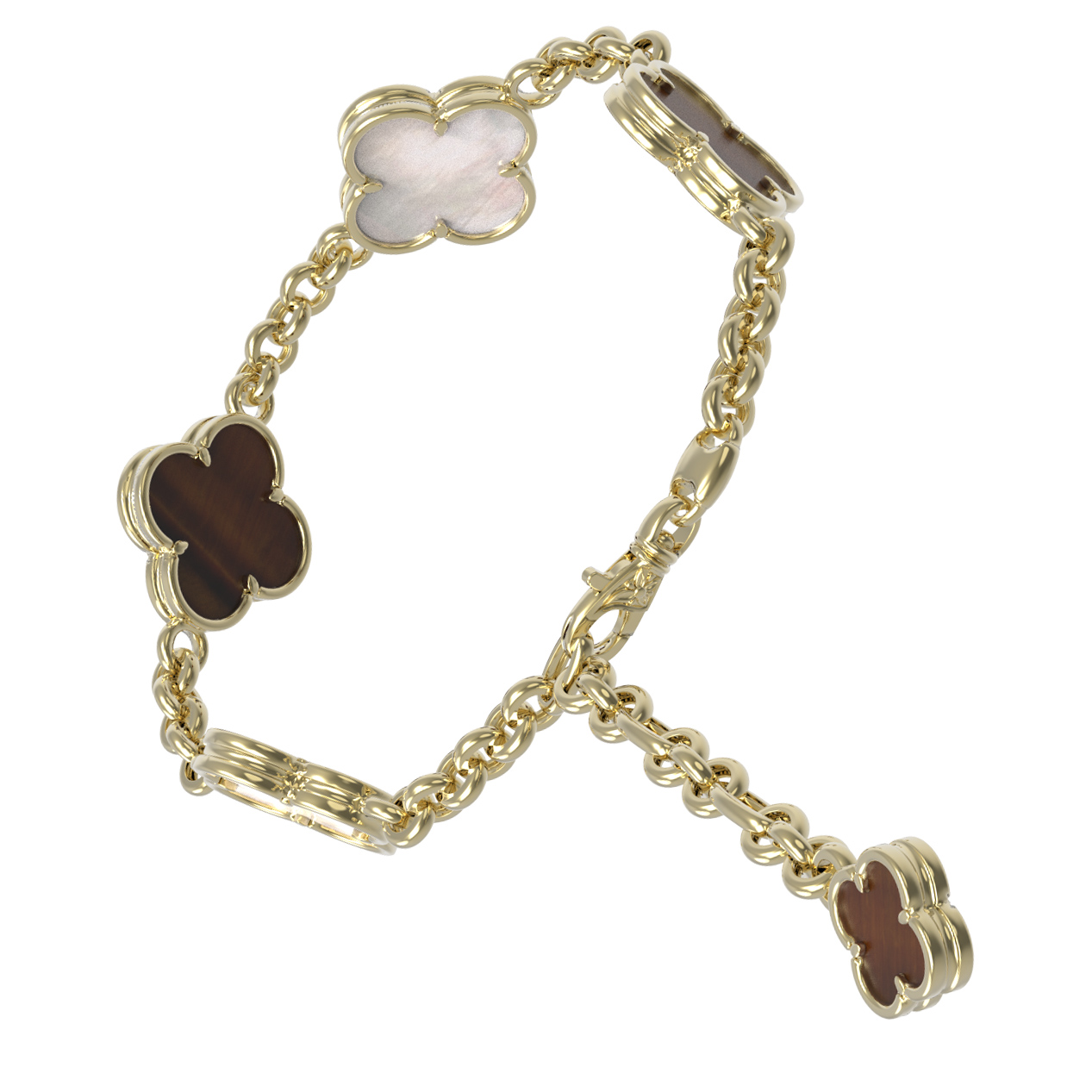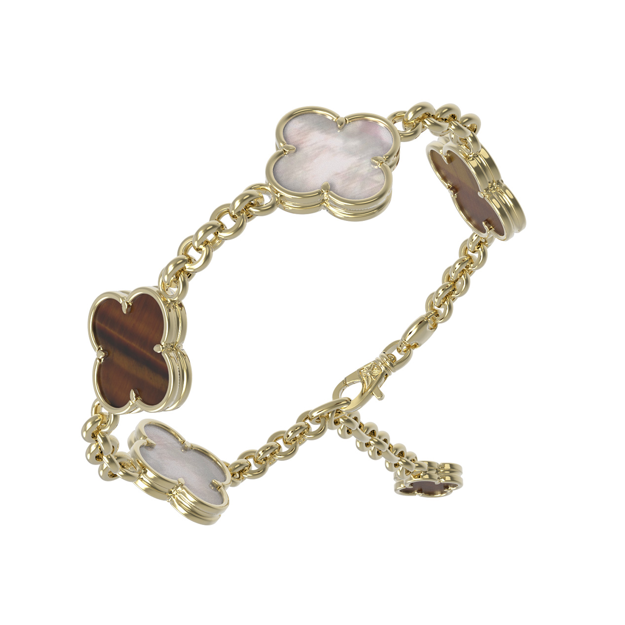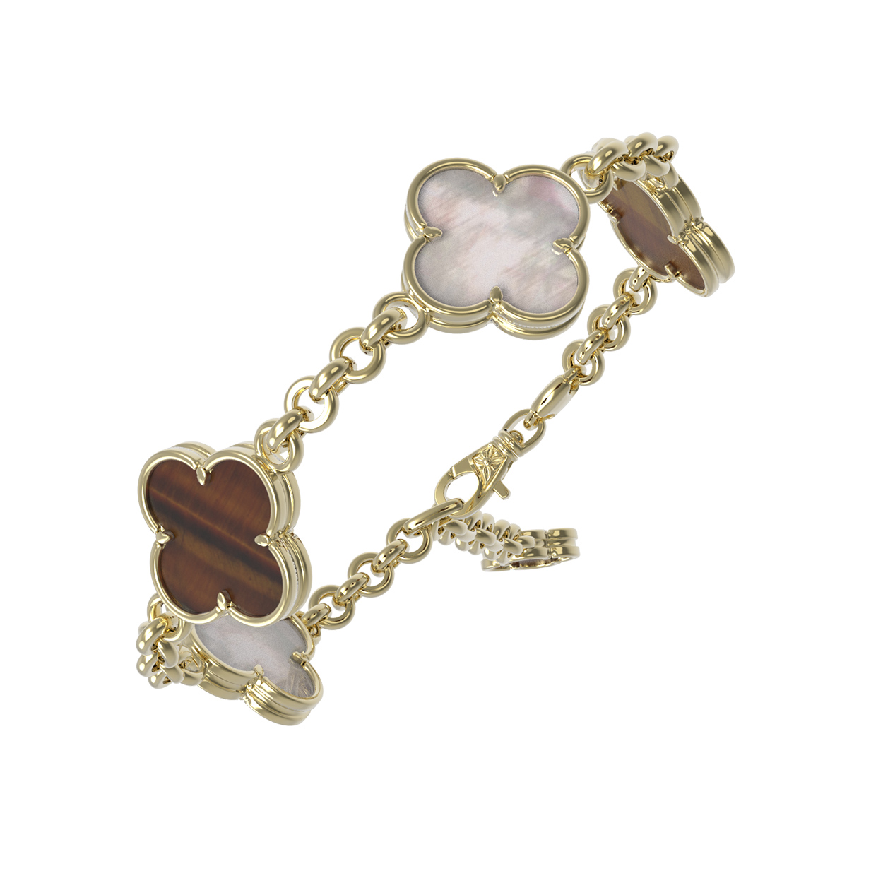 Центральными элементами композиции выступают 3 вставки, создающие эффектный визуальный контраст. Нежный перламутр с его мягким мерцанием перекликается с глубоким оранжевым оттенком натурального тигрового глаза. Такое сочетание материалов придает украшению многогранность и живость, позволяя ему гармонично смотреться при любом освещении. Качественная проработка деталей лимонного золота гарантирует долговечность и безупречный вид аксессуара при ежедневном ношении.