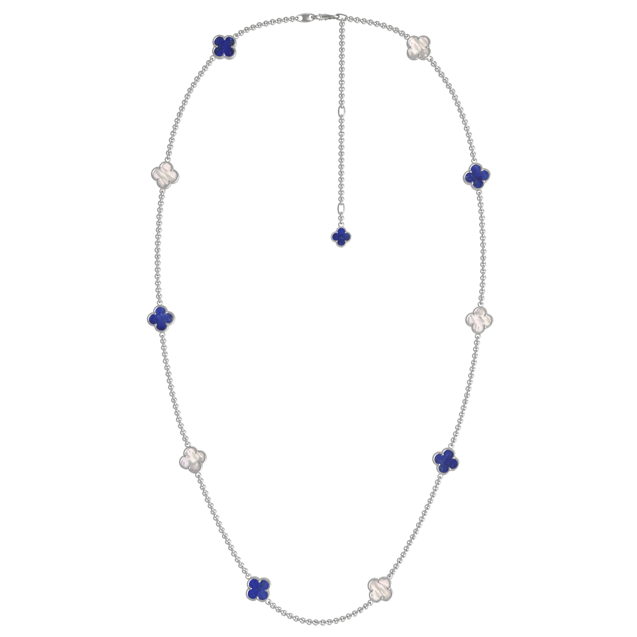 Для создания контрастного и притягательного образа мастера использовали два вида натуральных камней. Глубокий и насыщенный синий лазурит эффектно сочетается с нежным перламутром, чье мягкое сияние подчеркивает благородный блеск металла. Такое цветовое решение делает колье универсальным дополнением как для повседневного, так и для вечернего гардероба.