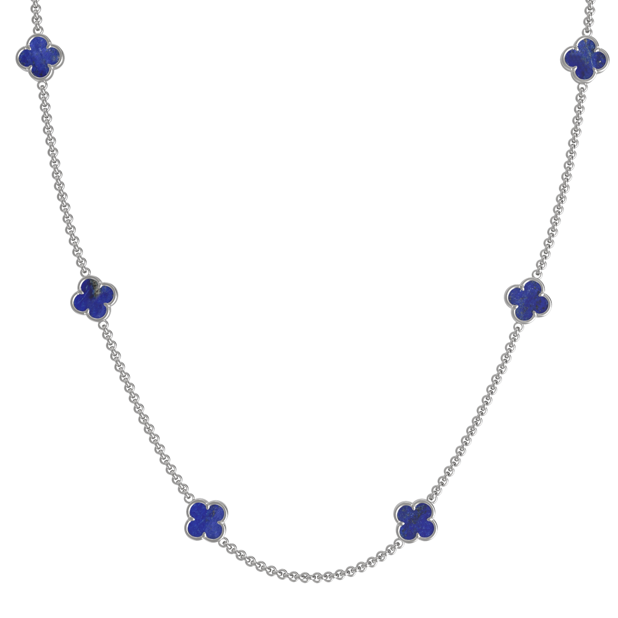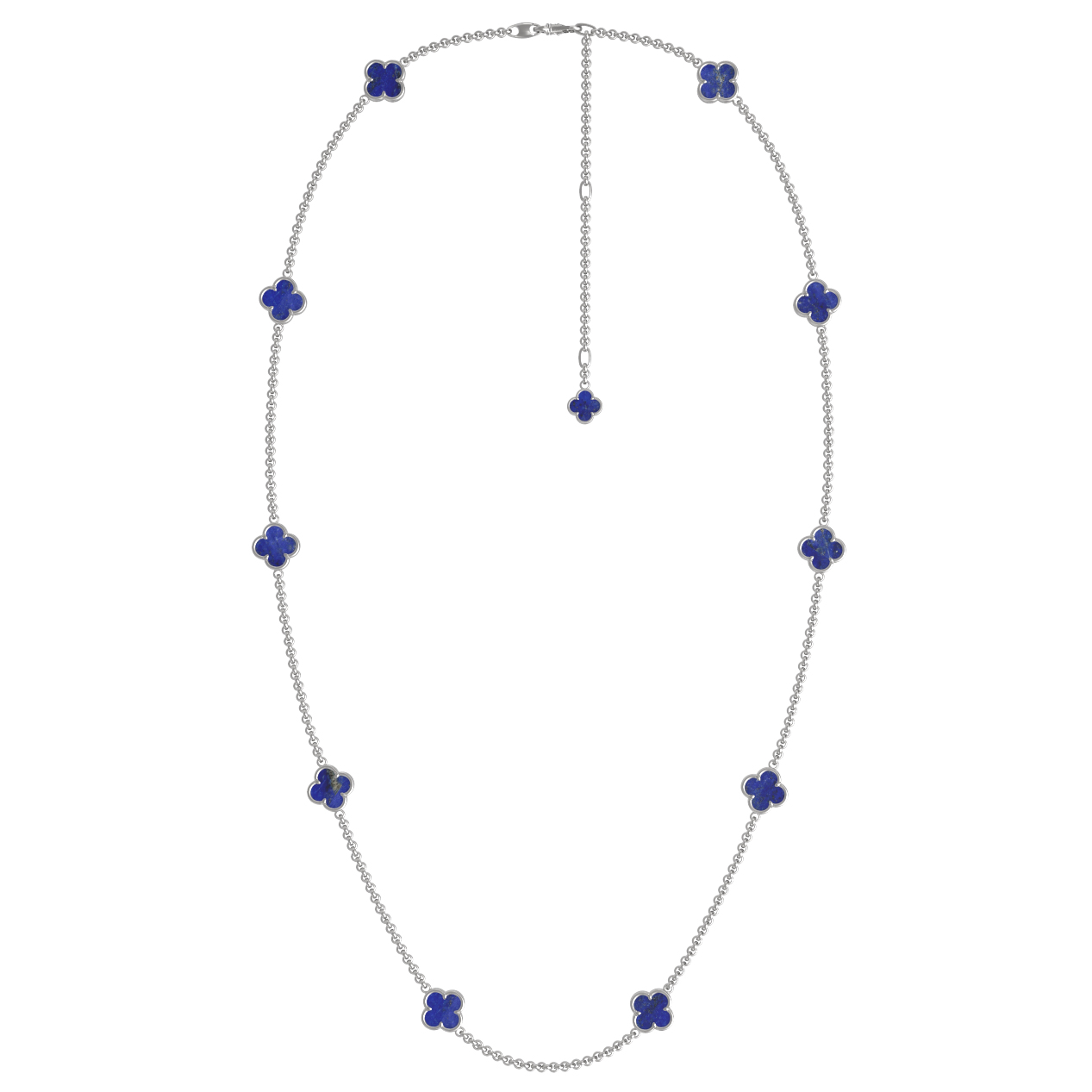 В качестве декора использовано 11 вставок из лазурита синего цвета, которые создают яркий контраст с оправой из белого золота. Глубокий оттенок камней привлекает внимание и придает украшению особую статусность. Это колье является универсальным аксессуаром, который одинаково гармонично дополнит стиль как для женщин, так и для мужчин, подчеркивая индивидуальность и вкус своего владельца.