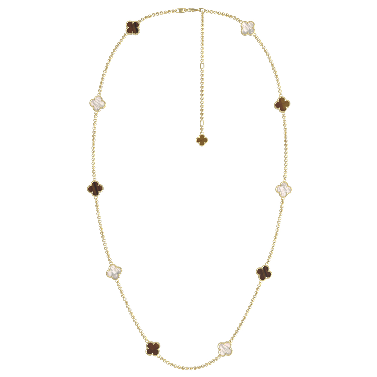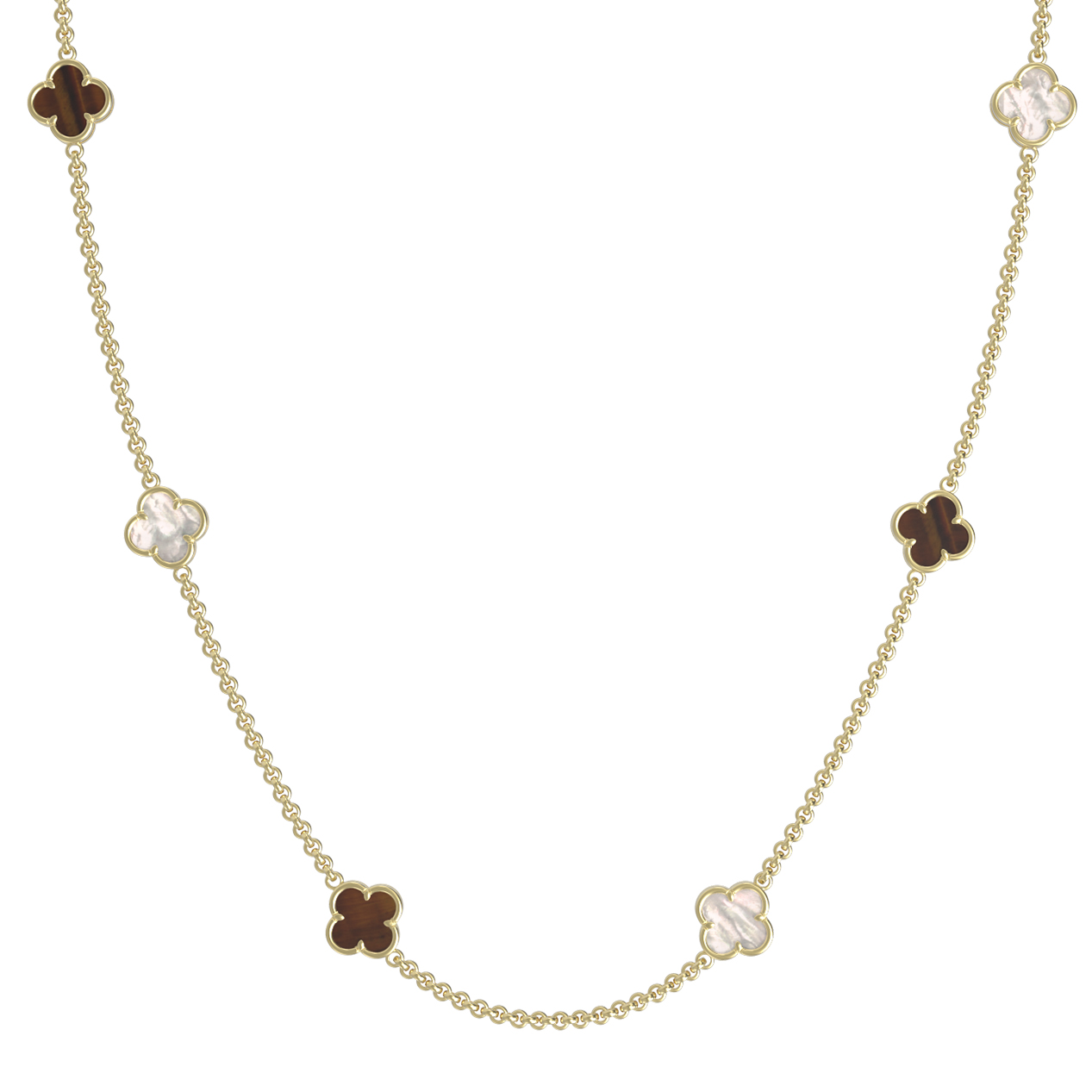Колье из лимонного золота 585 пробы из коллекции De Luxe — Клевер весна — это утонченное украшение, которое станет акцентом вашего образа. Дизайнерское исполнение в виде клевера придает изделию особое очарование и символизирует удачу, делая его идеальным выбором как для женщин, так и для мужчин. В основе композиции лежит благородный блеск лимонного золота, который гармонично дополнен вставками из перламутра и тигрового глаза.