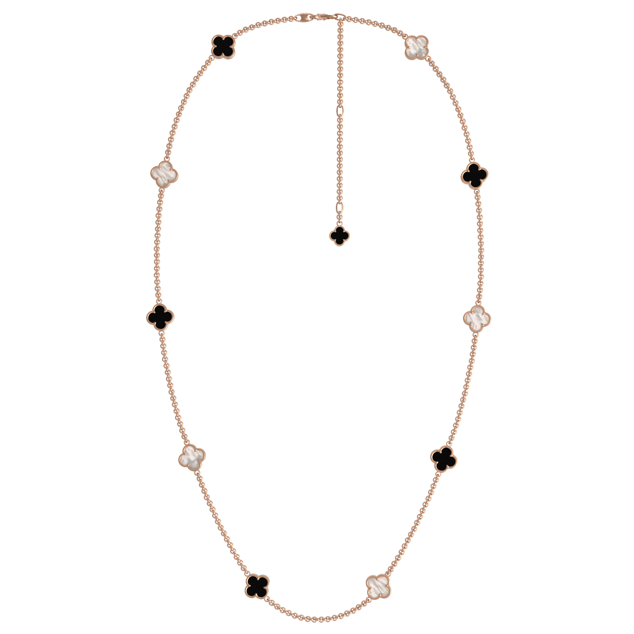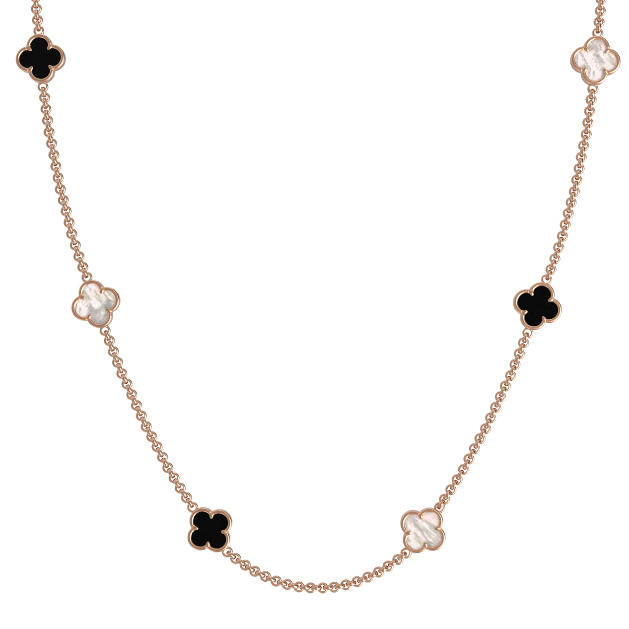 В отделке использованы контрастные вставки: благородный черный оникс и нежный переливающийся перламутр. Всего модель украшают 6 вставок, которые эффектно выделяются на фоне теплого сияния красного золота. Универсальный дизайн позволяет носить это колье как женщинам, так и мужчинам, дополняя повседневные или вечерние наряды. Лаконичная цепочка с равномерно расположенными элементами смотрится изящно и современно, подчеркивая статус и безупречный вкус владельца.