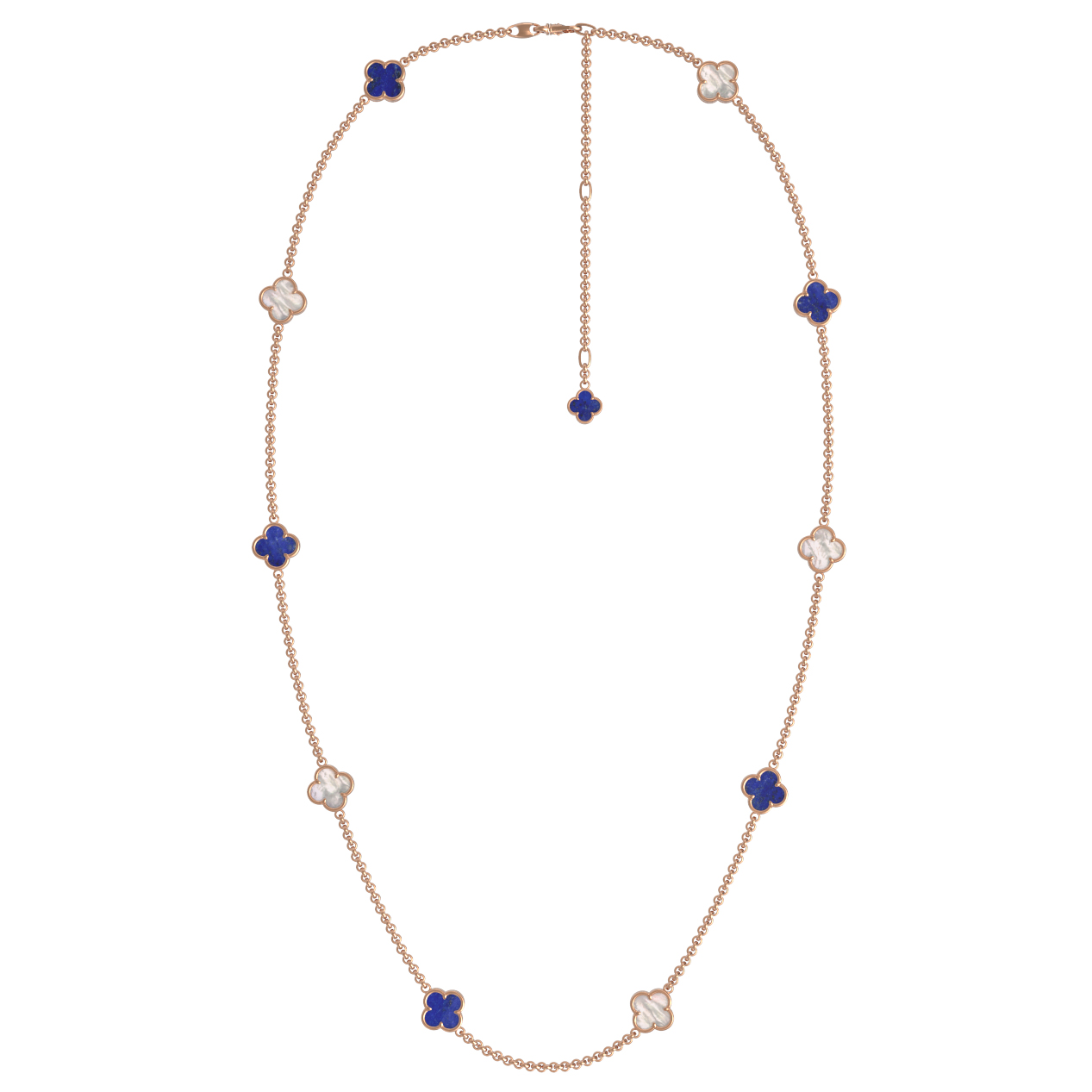 Центральными элементами композиции выступают шесть вставок, выполненных из благородного лазурита глубокого синего цвета и нежного перламутра. Контраст между насыщенным оттенком камней и теплым сиянием красного золота создает выразительный визуальный эффект. Чередование синего лазурита и светлого перламутра придает изделию динамику и делает его универсальным аксессуаром, который легко сочетается как с деловым костюмом, так и с вечерним нарядом.