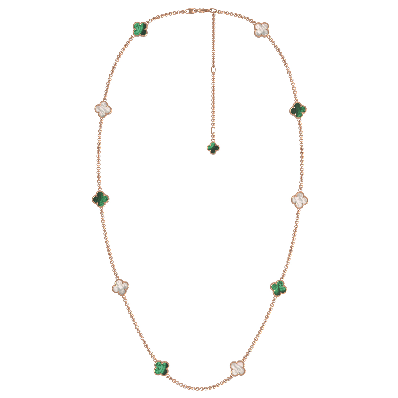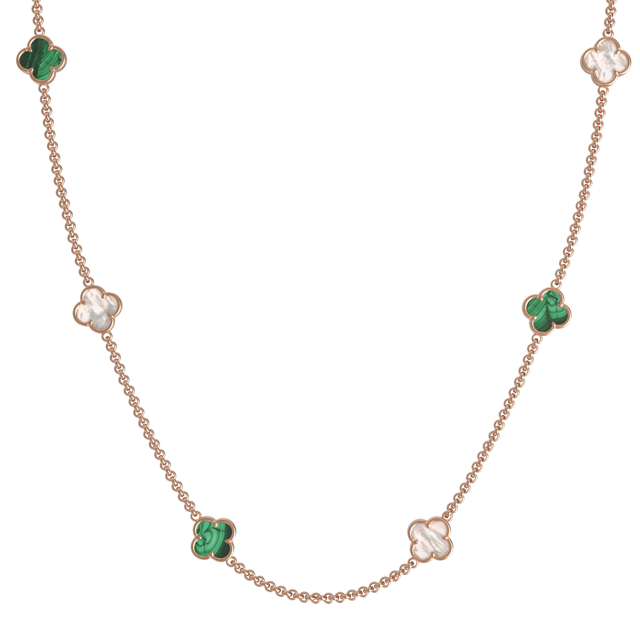 В центре композиции располагаются 6 вставок, чередующих загадочный зеленый малахит и нежный переливающийся перламутр. Такое контрастное сочетание вставок делает колье ярким и заметным, придавая ему особое очарование. Красный цвет золота гармонично дополняет природные оттенки камней, создавая целостный и притягательный ансамбль.