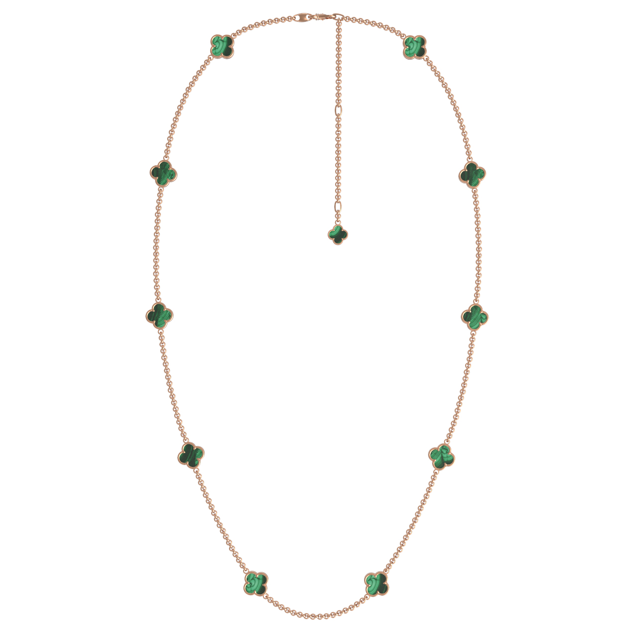 В модели предусмотрено 11 вставок, равномерно расположенных по всей длине цепочки, что делает колье выразительным и заметным украшением. Данное изделие является универсальным аксессуаром, который подходит как для женщин, так и для мужчин, предпочитающих утонченные и стильные ювелирные решения. Малахит с его неповторимым природным узором подчеркивает премиальное качество исполнения.