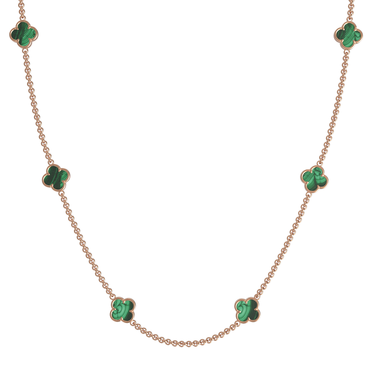 Элегантное колье из красного золота 585 пробы из коллекции De Luxe — Клевер весна станет изысканным акцентом вашего образа. Дизайн изделия выполнен в виде символичного клевера, который придает украшению особое очарование и эстетическую завершенность. Глубокий зеленый цвет вставок из натурального малахита гармонично сочетается с теплым блеском металла, создавая притягательный и благородный контраст.