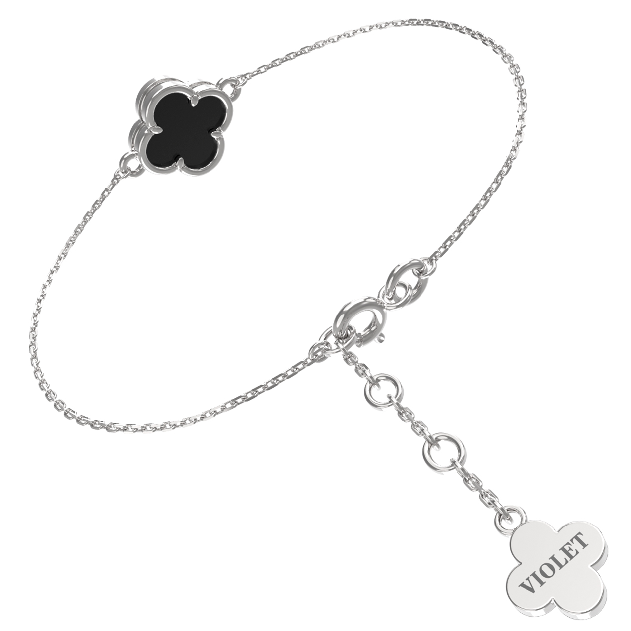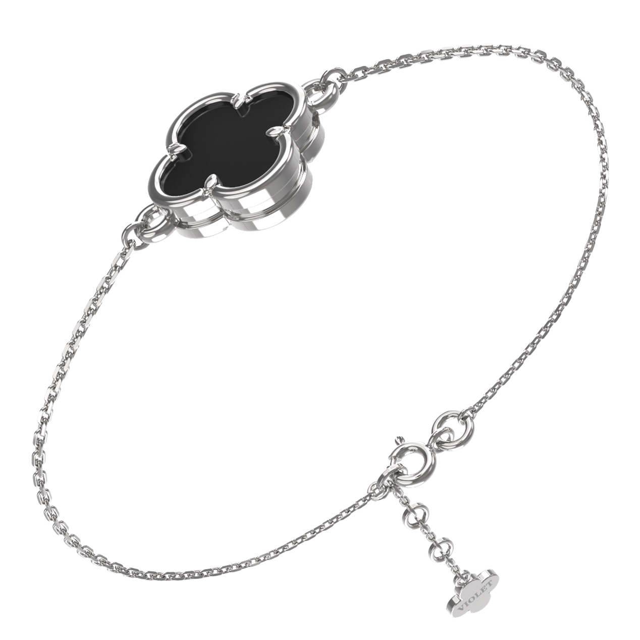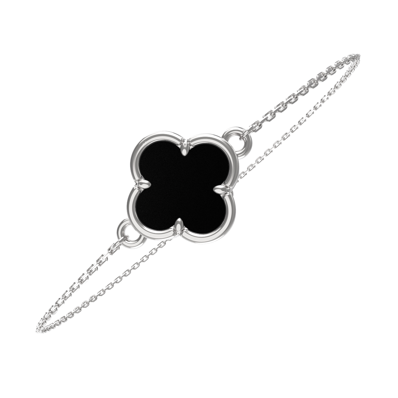 Элегантный браслет из белого золота 585 пробы из коллекции De Luxe — Клевер весна станет безупречным дополнением вашего образа. Это утонченное ювелирное украшение выполнено в лаконичном дизайне в форме клевера, который считается символом удачи и гармонии. Холодный блеск благородного белого металла идеально сочетается с глубоким черным цветом вставки. Центральным элементом композиции является одна выразительная вставка из оникса, придающая изделию особую глубину и выразительность.