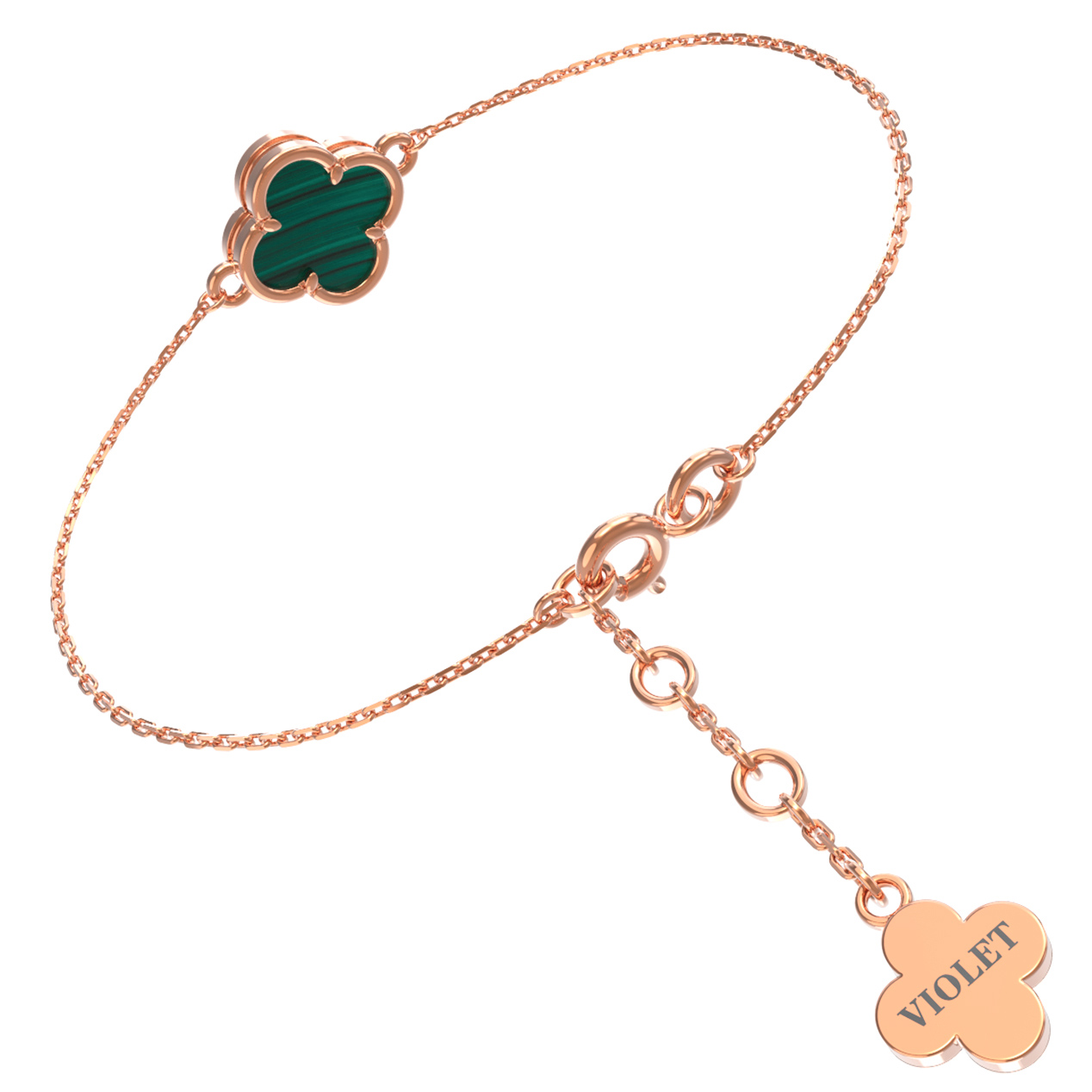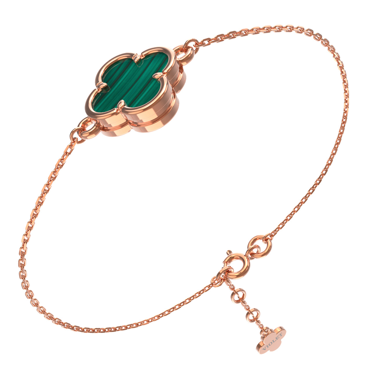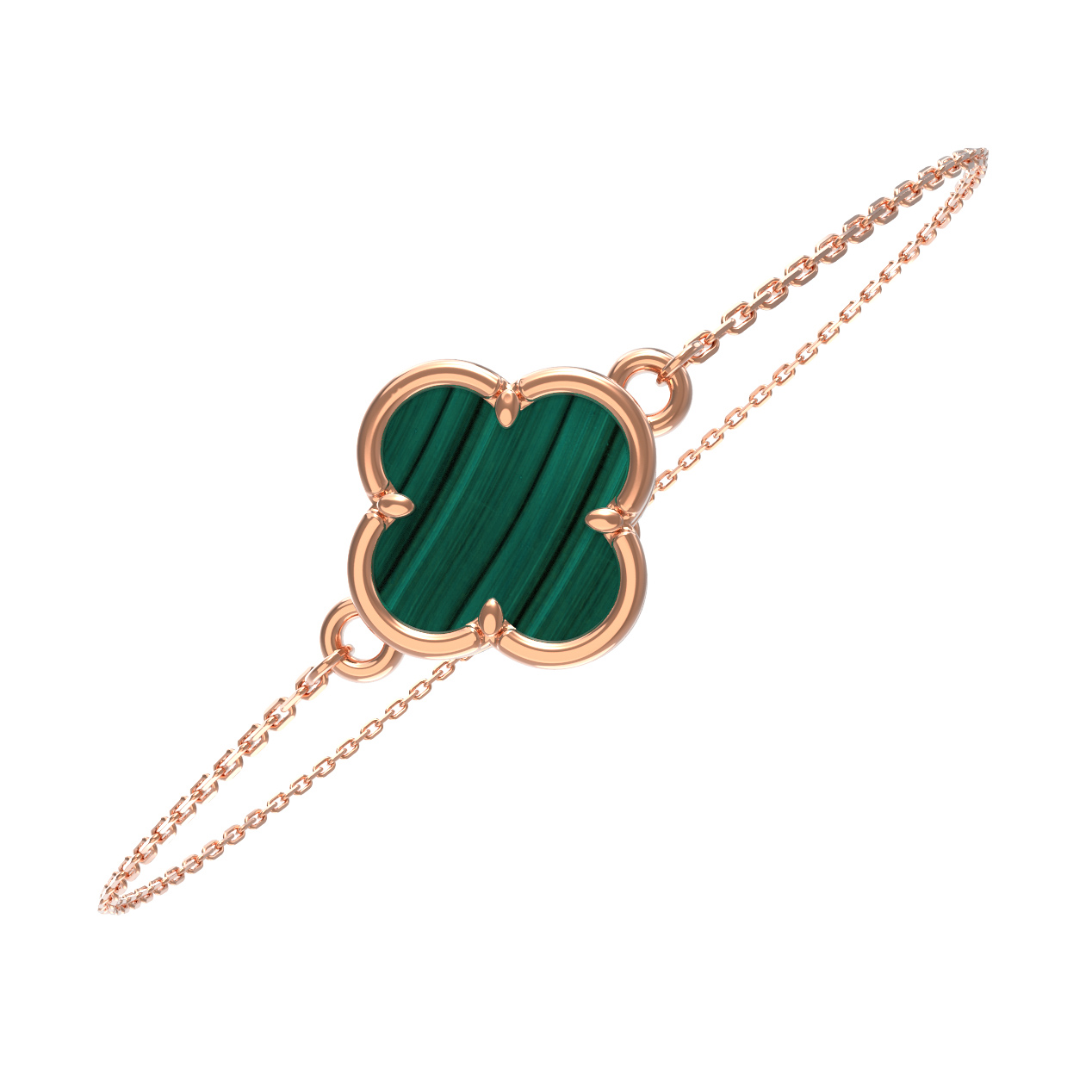 Изысканный браслет из красного золота 585 пробы станет утонченным дополнением вашего образа. Это изделие, представленное в коллекции De Luxe — Клевер весна, воплощает гармоничное сочетание классической элегантности и современных дизайнерских решений. Центральным элементом украшения выступает вставка из натурального малахита глубокого зелёного цвета, огранка и форма которой идеально подчеркивают природную красоту минерала.