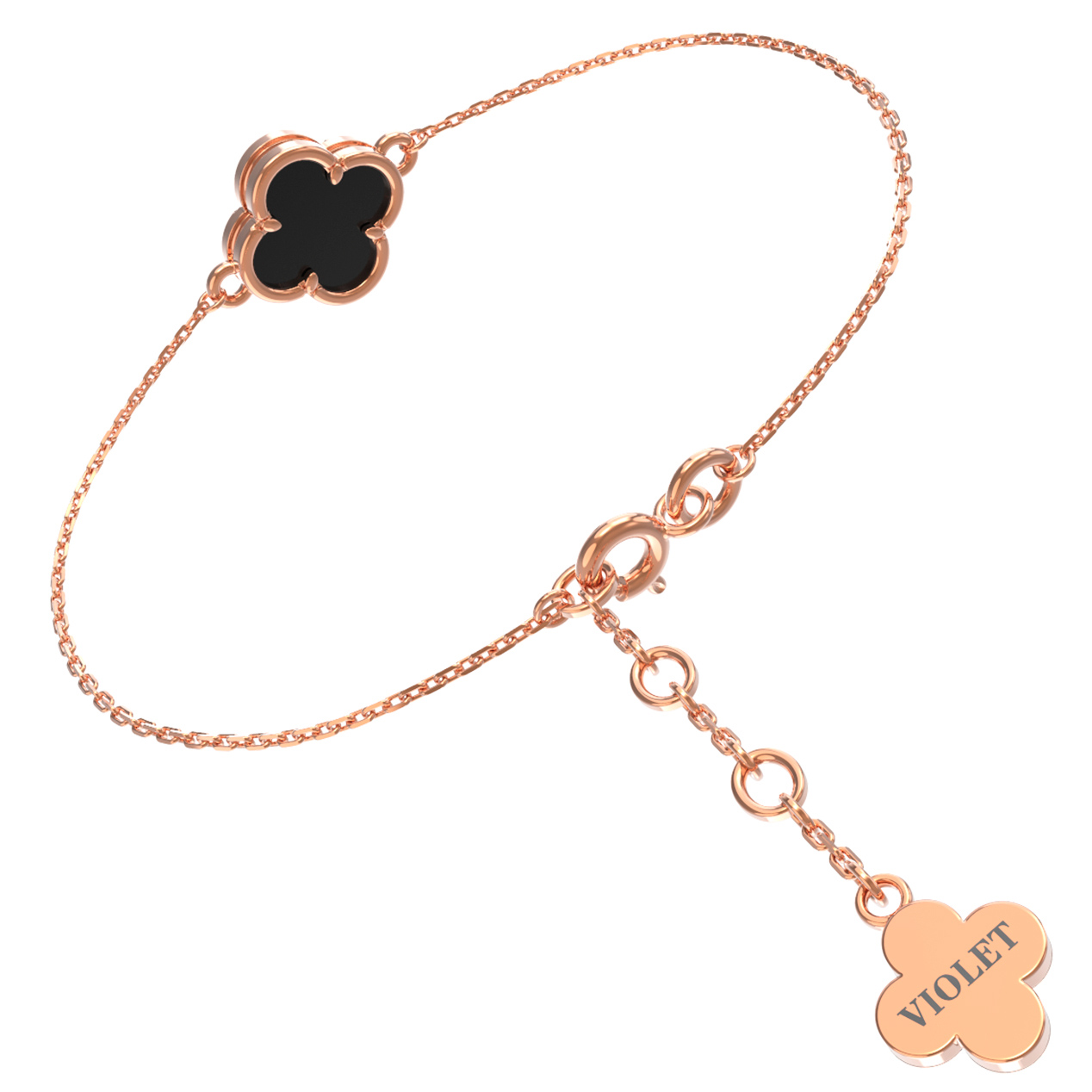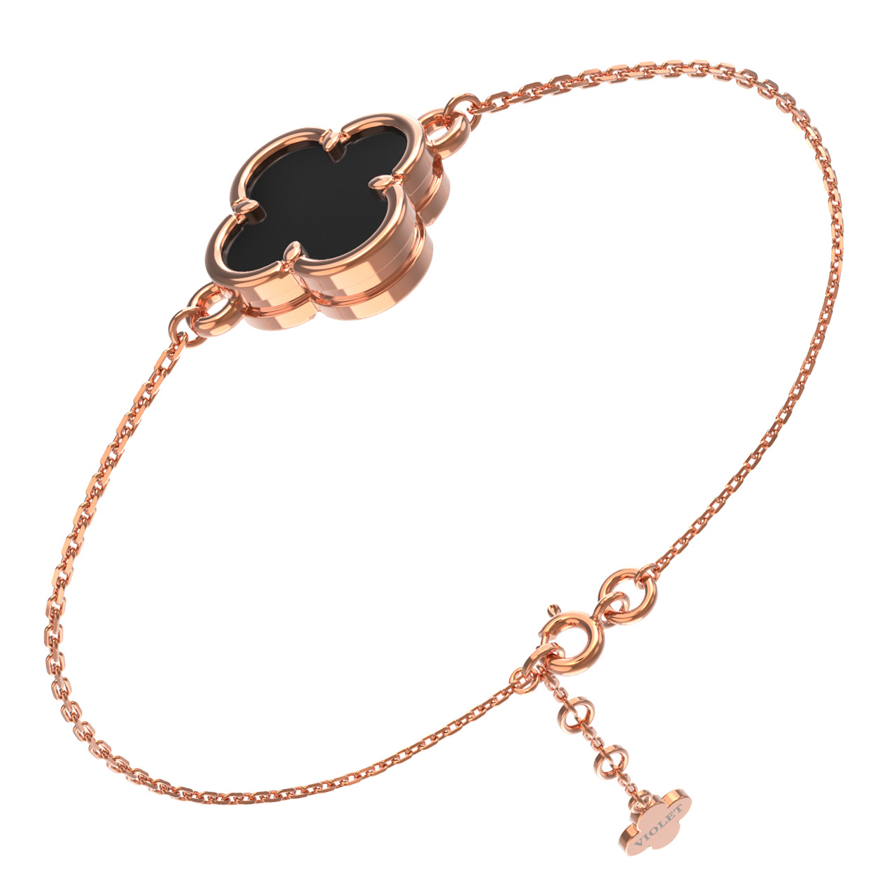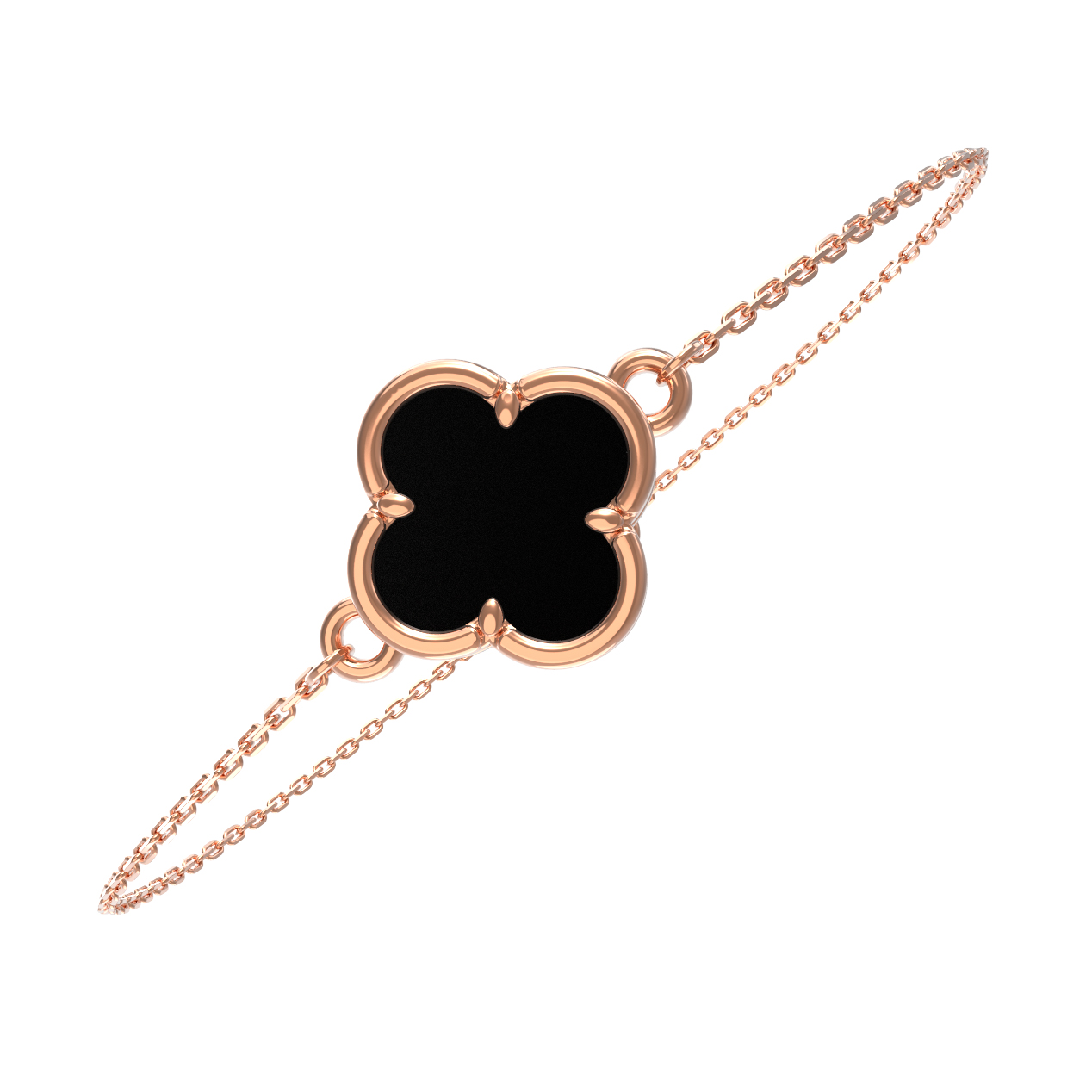 Изысканный браслет из красного золота 585 пробы — это воплощение элегантности и утонченного стиля. Данное украшение, выполненное в рамках серии De Luxe — Клевер весна, привлекает внимание своим лаконичным и узнаваемым дизайном в виде четырехлистного клевера. Центральным элементом композиции является одна вставка из натурального оникса, глубокий черный цвет которой эффектно контрастирует с теплым блеском металла.