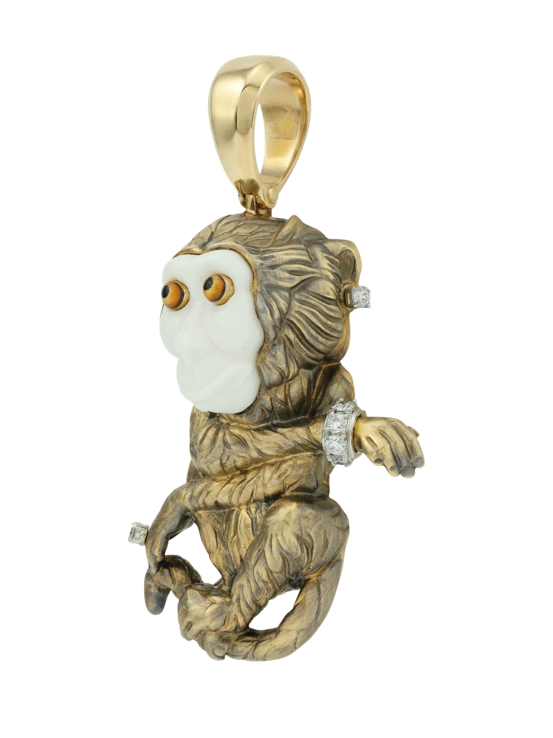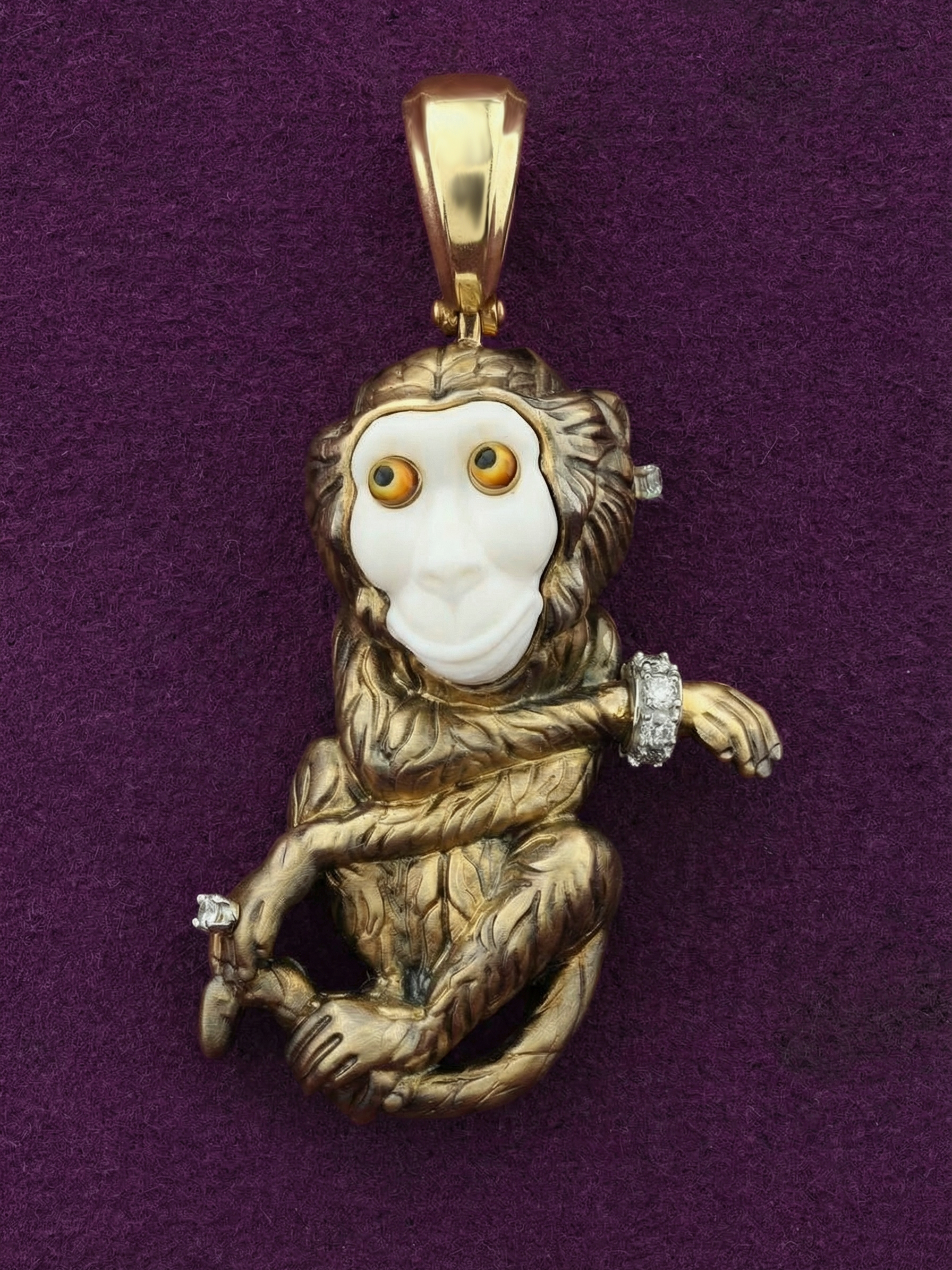 Эксклюзивная подвеска из коллекции De luxe Premium — Обезьяна — модница станет ярким акцентом в вашем образе, привлекая внимание своим необычным и харизматичным дизайном. Это оригинальное ювелирное изделие в виде очаровательной обезьяны выполнено из лимонного золота 585 пробы. Детализация фигурки поражает: искусная проработка текстуры шерсти в сочетании с элементами из эмали создает живой и выразительный облик.