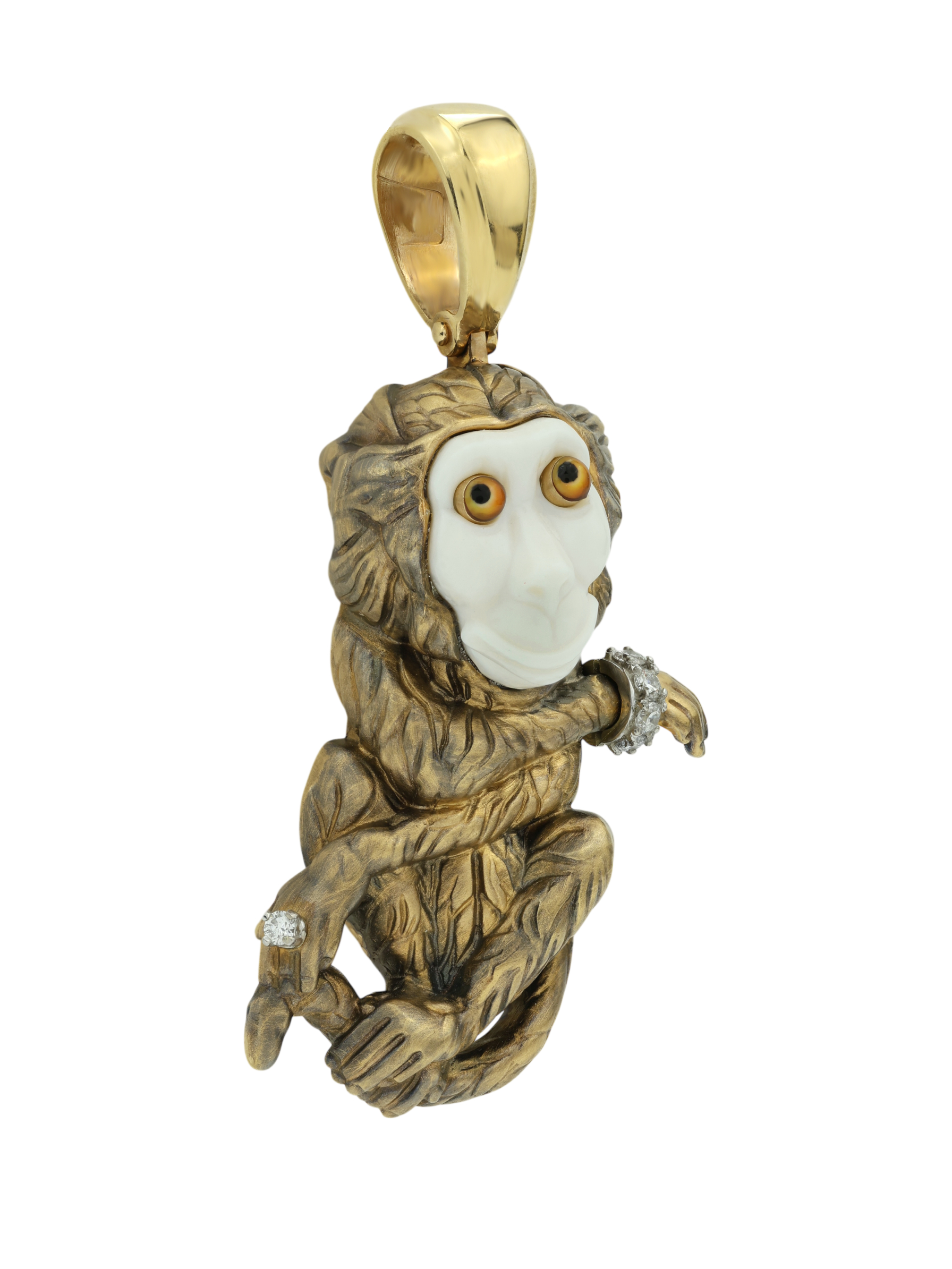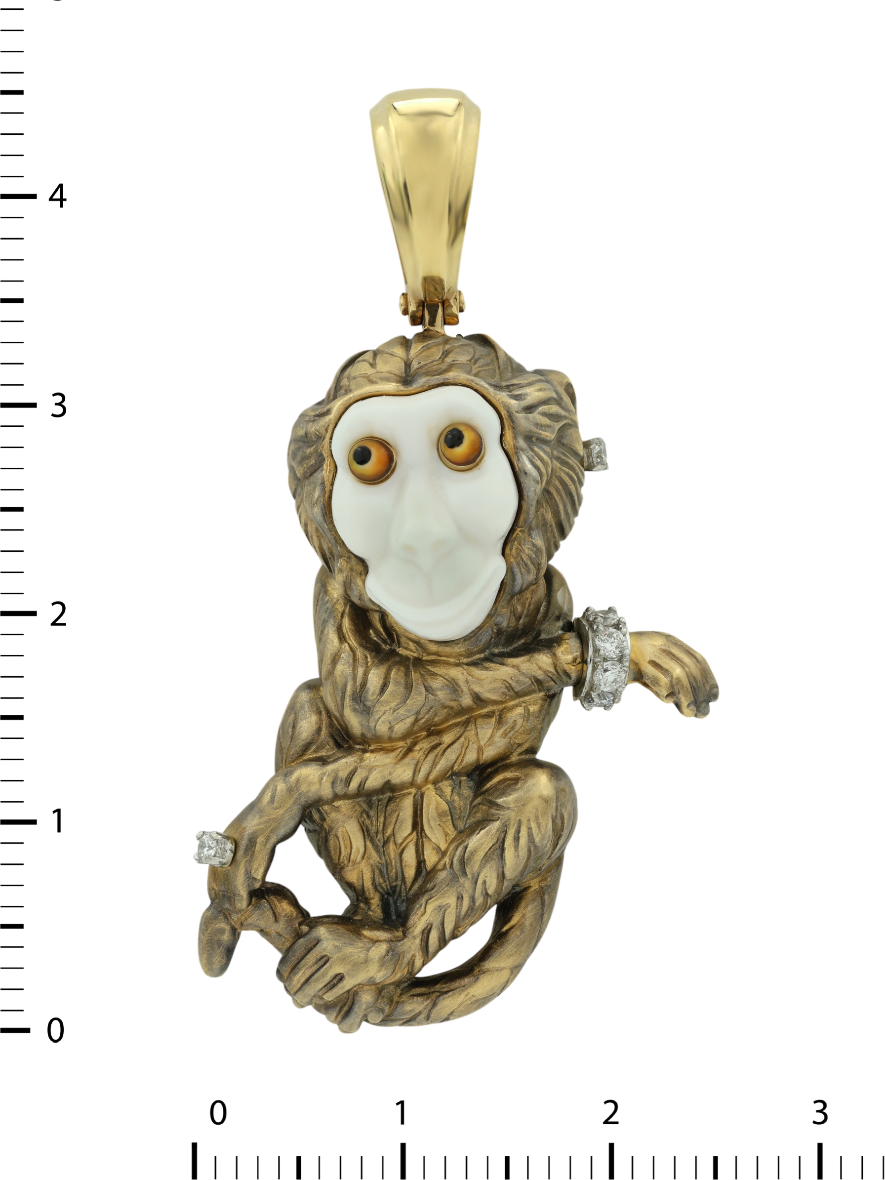 Особую художественную ценность украшению придает лицо обезьяны, выполненное из натурального бивня мамонта, что делает каждый экземпляр уникальным. Глаза персонажа украшены яркими красными рубинами круглой формы, которые добавляют взгляду глубину. В качестве изысканного декора использованы 7 сверкающих бриллиантов круглой огранки белого цвета, инкрустированные в браслет на лапке и подчеркивающие статусность изделия.