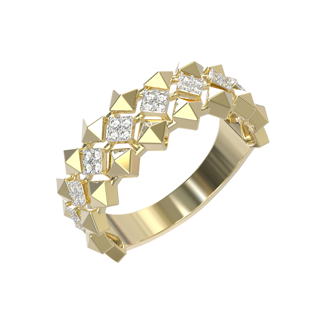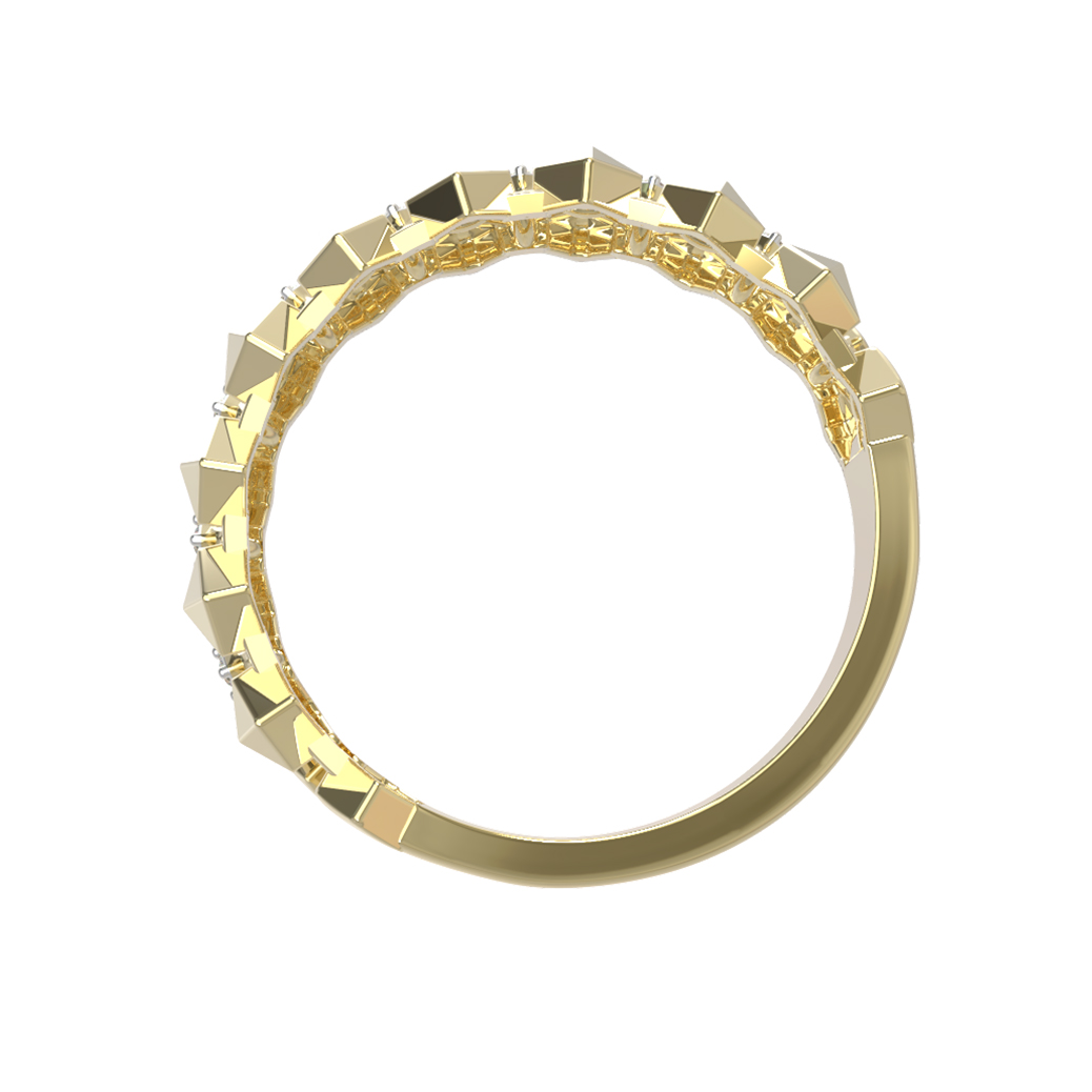 Кольцо из лимонного золота 585 пробы из коллекции De Luxe Бриллианты — это эффектное ювелирное изделие, сочетающее в себе дерзкую геометрию и утонченное сияние драгоценных камней. Дизайн модели привлекает внимание сложной фактурой: чередование пирамидальных золотых элементов с инкрустированными вставками создает выразительный объем, который смотрится эффектно на любом пальце. В кольце использованы 32 белых бриллианта круглой огранки, которые привносят в украшение игру света и благородный блеск.