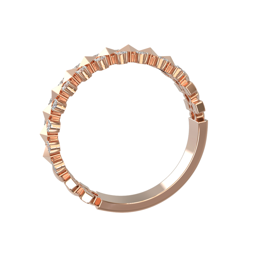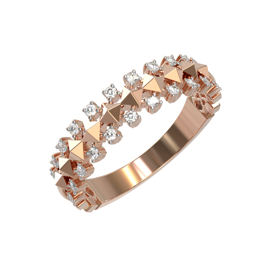 Элегантное кольцо из красного золота 585 пробы — это воплощение современного дизайна и безупречного ювелирного мастерства. Изделие из коллекции De Luxe Бриллианты привлекает внимание своей необычной геометрической формой, сочетая классический благородный металл с выразительными акцентами. Поверхность кольца украшена чередующимися металлическими пирамидами и сверкающими вставками, что придает украшению объем и динамику. В дизайне использовано 22 бриллианта круглой формы с чистым белым цветом, которые создают завораживающую игру света при каждом движении.