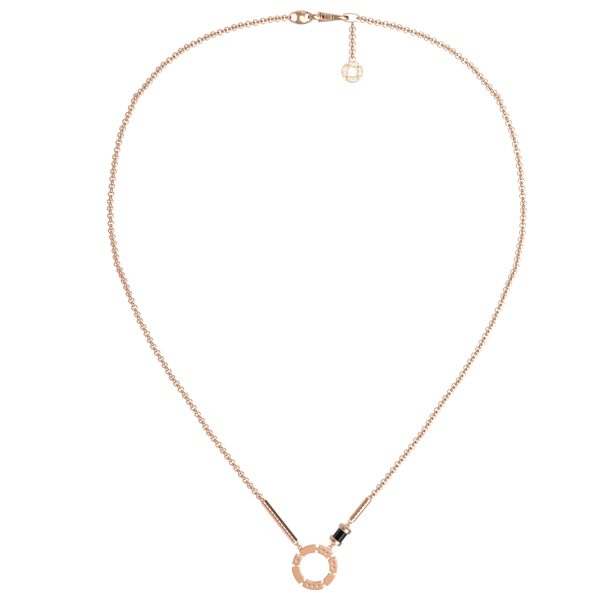 В декоре использованы 78 вставок: глубокий черный оникс цилиндрической формы эффектно дополняет сияние бриллиантов круглой огранки. Сочетание теплого оттенка красного золота с контрастными белыми и черными вставками создает выразительный акцент, который гармонично дополнит как деловой костюм, так и вечерний образ. Универсальный характер украшения позволяет носить его как женщинам, так и мужчинам, подчеркивая индивидуальность владельца.