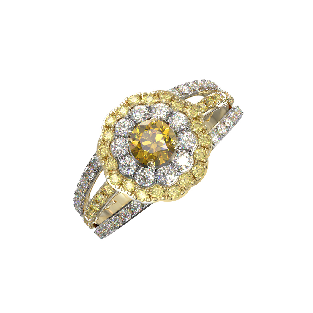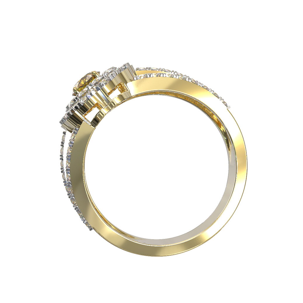 Дизайн изделия отличается сложной детализацией: декоративная часть украшена 79 вставками круглой огранки. Сочетание желтого и белого цветов вставок — бриллиантов и сапфиров — создает эффектный контраст с благородным блеском лимонного золота. Двойная шинка кольца, также инкрустированная драгоценными камнями, придает модели динамичность и визуальную легкость, несмотря на массивность и богатство исполнения.