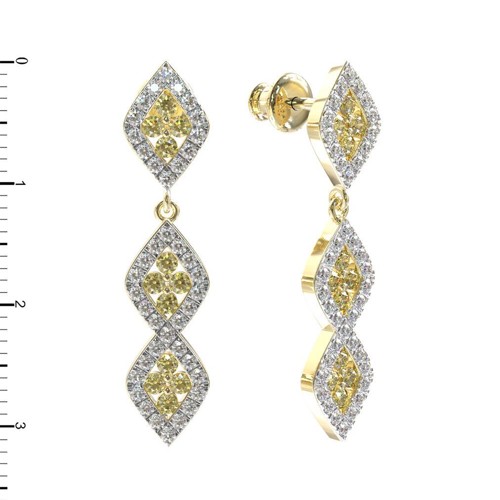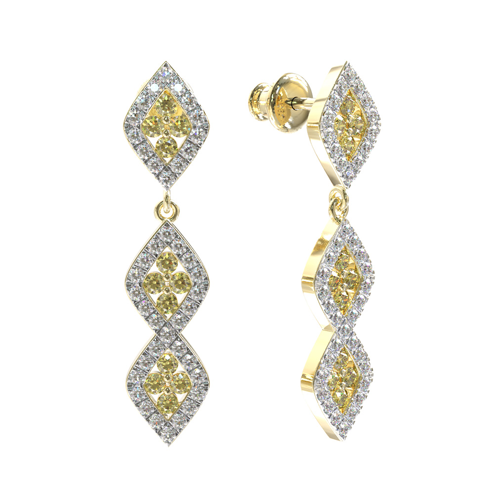 Особую изысканность изделию придают вставки в количестве 106 штук. Центр каждого элемента украшен яркими желтыми сапфирами круглой формы, которые гармонично дополняются сияющими белыми бриллиантами, обрамляющими контуры ромбов. Контраст благородного лимонного золота и цвета вставок делает серьги невероятно выразительными.