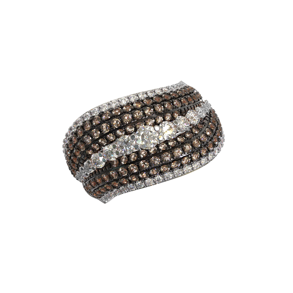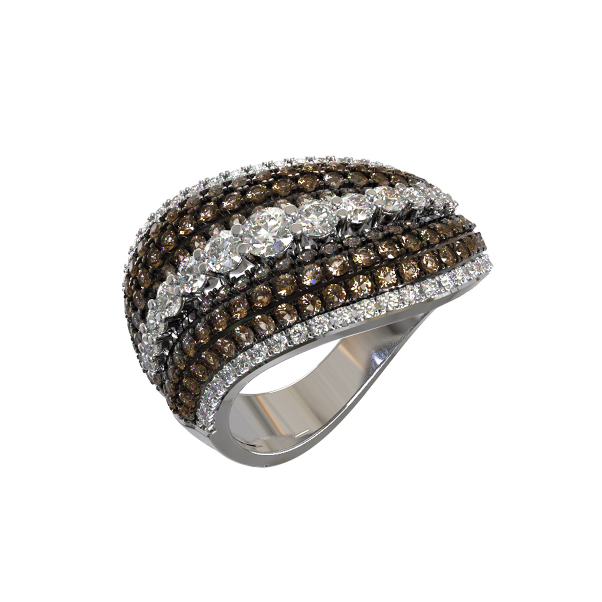 Роскошное кольцо из белого золота 585 пробы — это воплощение элегантности и безупречного стиля. Ювелирное изделие из коллекции De Luxe Бриллианты — Espresso притягивает взгляд своей сложной архитектурой и выразительным дизайном. Центральную часть композиции украшает полоса из крупных бриллиантов, обрамленная дорожками с множеством более мелких камней, создающих эффектный контраст и объем. Всего в украшении использовано 163 бриллианта круглой формы, которые ярко сияют благодаря белому цвету вставок и холодному блеску благородного металла.