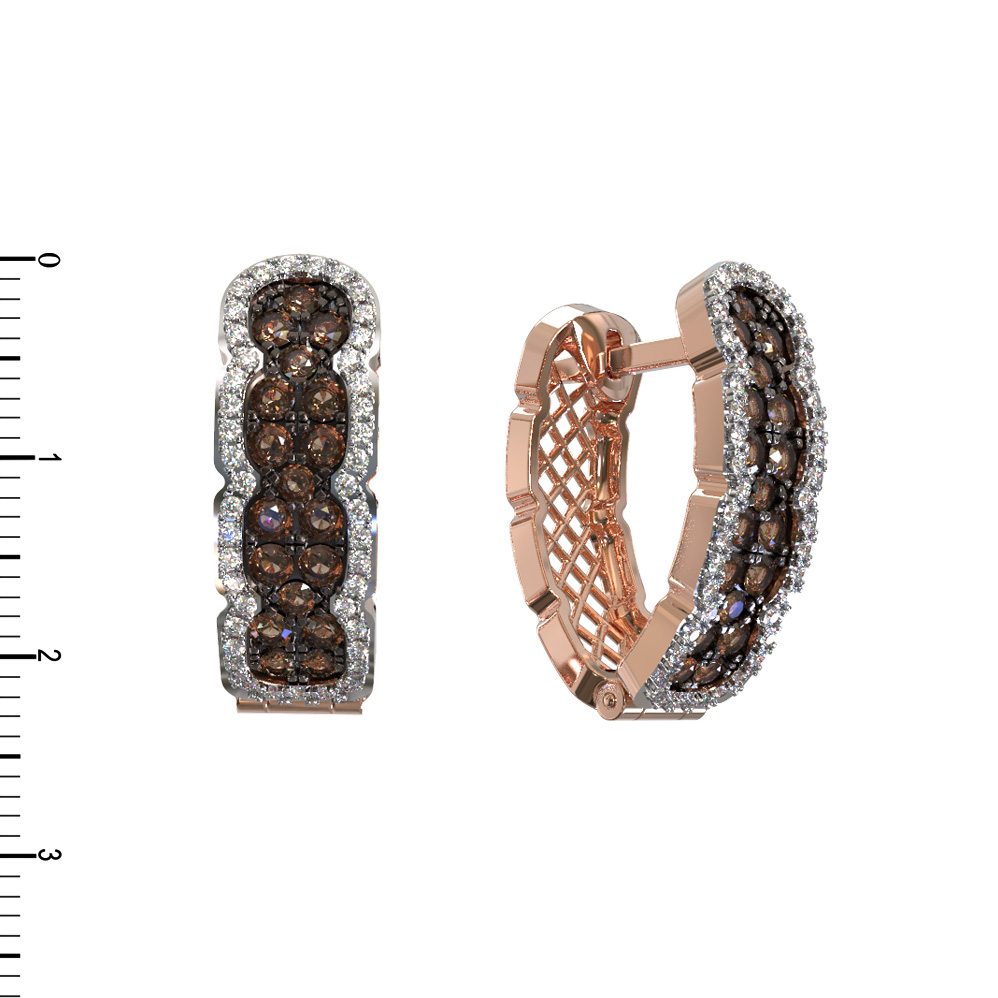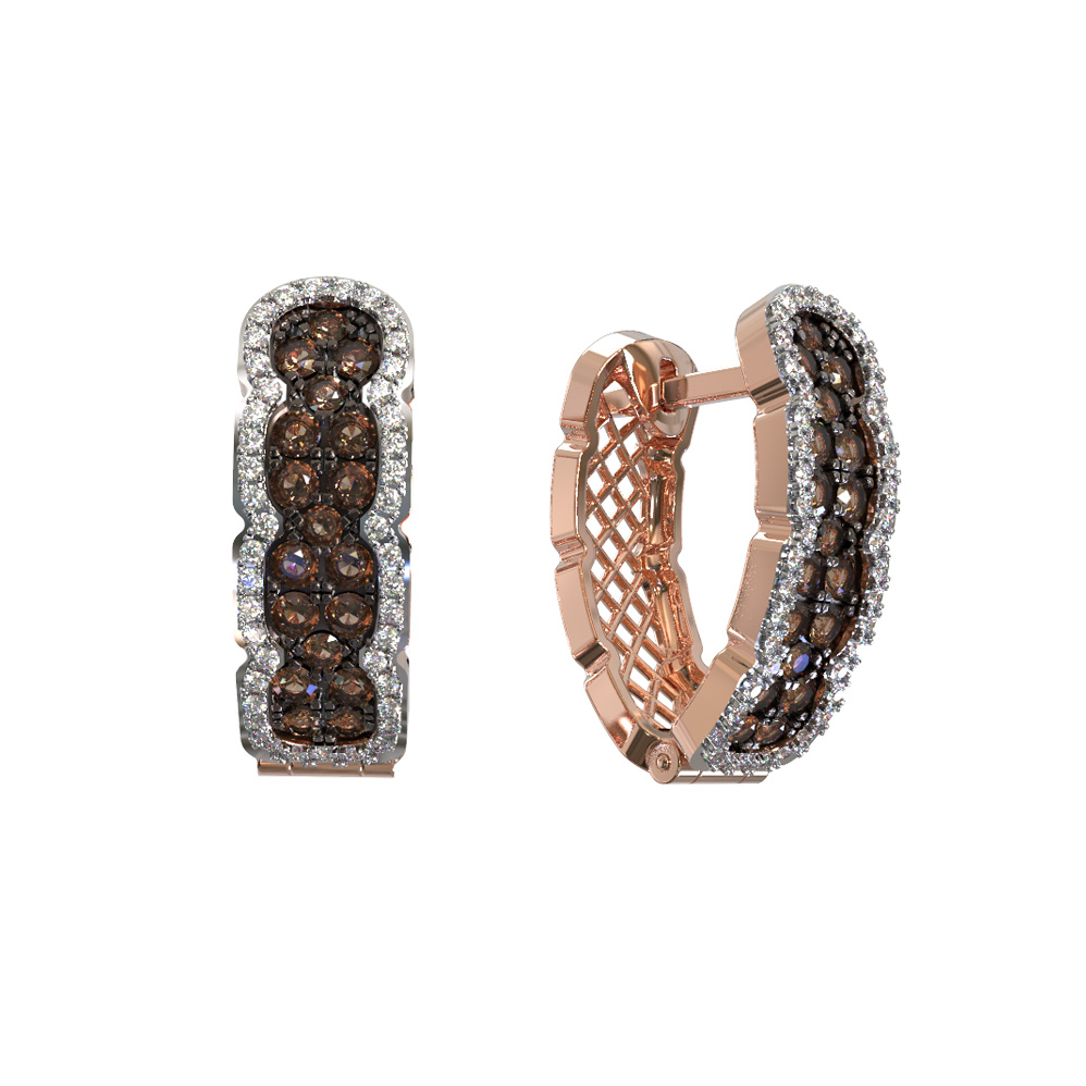 Центральным элементом композиции выступают 122 бриллианта круглой огранки. Особый шарм изделию придает насыщенный коричневый цвет вставок, который создает эффектное контрастное сочетание с классическим блеском драгоценных камней, обрамляющих декоративную часть серег. Сложная детализация и ажурная боковая часть подчеркивают высокий уровень ювелирного мастерства.