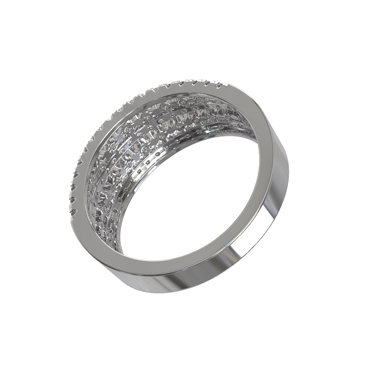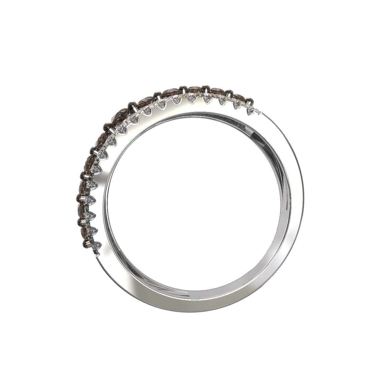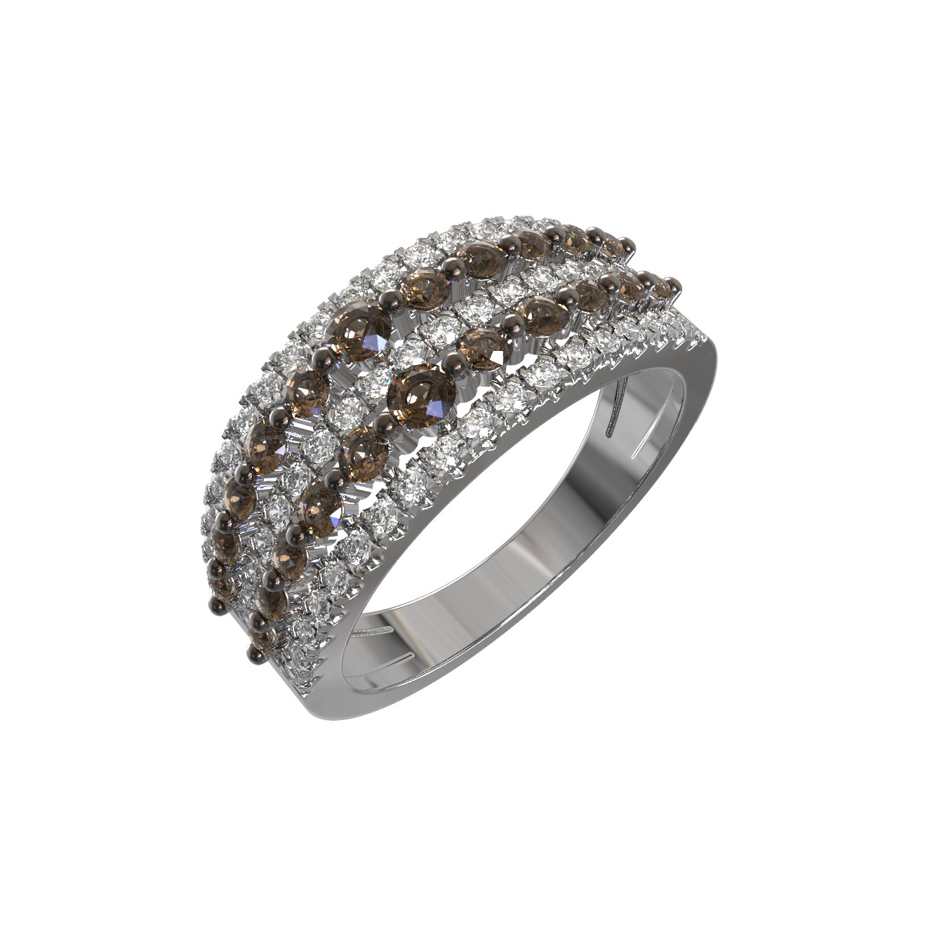 Композиция украшения построена на контрастах: основной акцент сделан на 76 бриллиантах круглой формы. Мастерство исполнения подчеркивает природную красоту камней, среди которых есть бриллианты классического цвета и эффектные коричневые вставки. Такое сочетание делает аксессуар выразительным и многогранным. Кольцо выполнено в широкой, массивной форме, что добавляет ему солидности.
