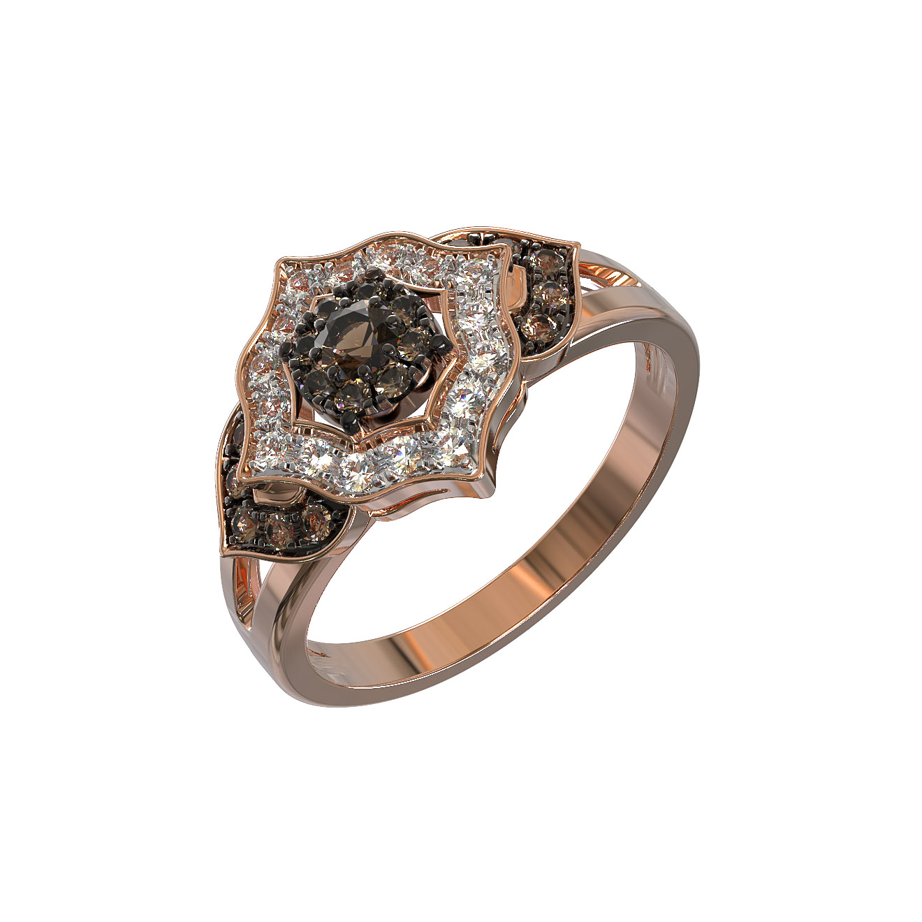 Основа украшения выполнена из благородного красного золота 585 пробы, которое придает изделию теплое, насыщенное сияние. Центральным элементом композиции является изящная декоративная площадка, инкрустированная 35 бриллиантами круглой формы. Особую притягательность дизайну придает благородный коричневый цвет вставок, который гармонично сочетается с красным золотом, создавая эффектную и завораживающую игру света.