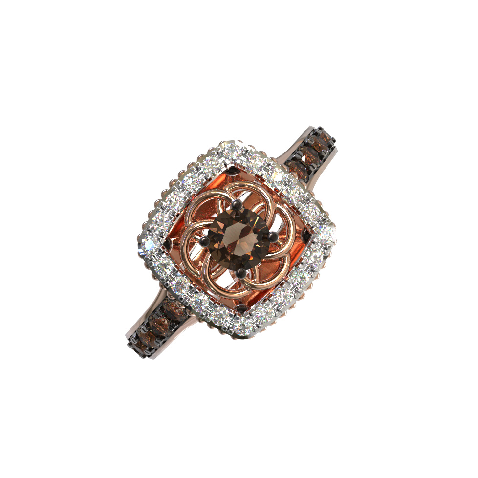 Элегантное кольцо из красного золота 585 пробы — это воплощение утонченного стиля и глубокой эстетики, представленное в коллекции De Luxe Бриллианты — Espresso. Ювелирное изделие приковывает взгляд своей сложной геометрией и сочетанием драгоценных материалов. В центре композиции расположен роскошный бриллиант круглой огранки глубокого коричневого оттенка, который создает интригующий контраст с блеском металла. Оправа изделия декорирована 31 бриллиантом, формирующим изысканный ореол вокруг центрального камня, что придает украшению неповторимое сияние при каждом движении.