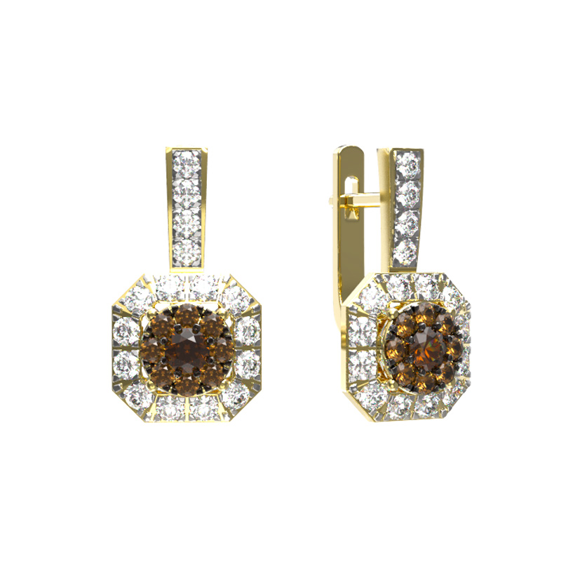 Центральным элементом композиции выступает инкрустация, состоящая из 50 вставок круглой формы. Глубокий, насыщенный коричневый цвет бриллиантов гармонично перекликается с теплым сиянием лимонного золота, создавая эффектный контраст и игру света. Высокое качество исполнения и внимание к деталям позволяют этим серьгам выглядеть дорого и статусно.