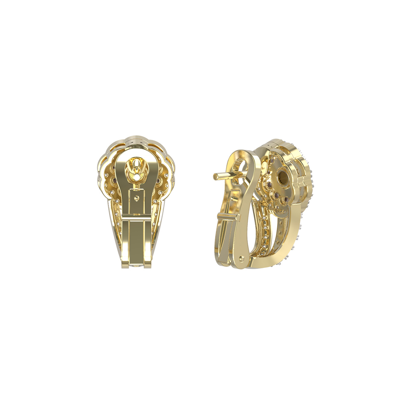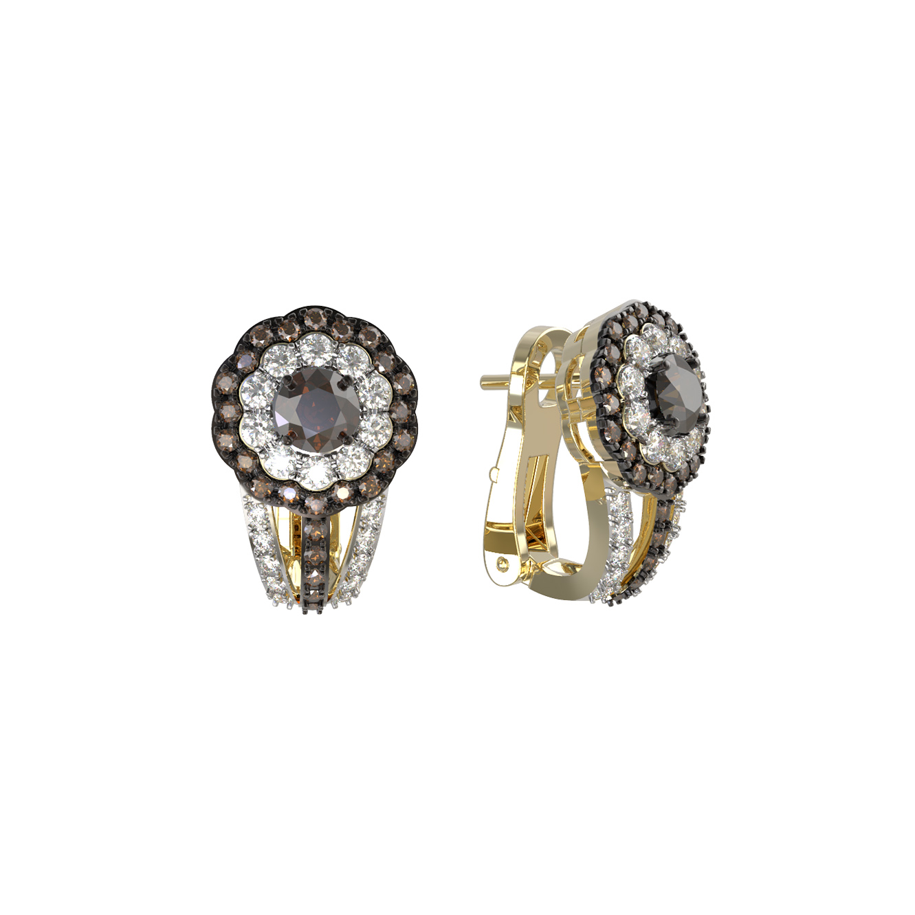 Серьги украшены россыпью из 92 бриллиантов, создающих эффектное мерцание. В центре композиции расположены камни, гармонирующие с общим стилем, а коричневый цвет вставок добавляет украшению особую глубину и выразительность. Все бриллианты имеют классическую круглую форму огранки, которая максимально раскрывает их природную красоту. Лимонный оттенок золота служит идеальной оправой, подчеркивая блеск драгоценных камней и придавая изделию теплый, благородный вид.