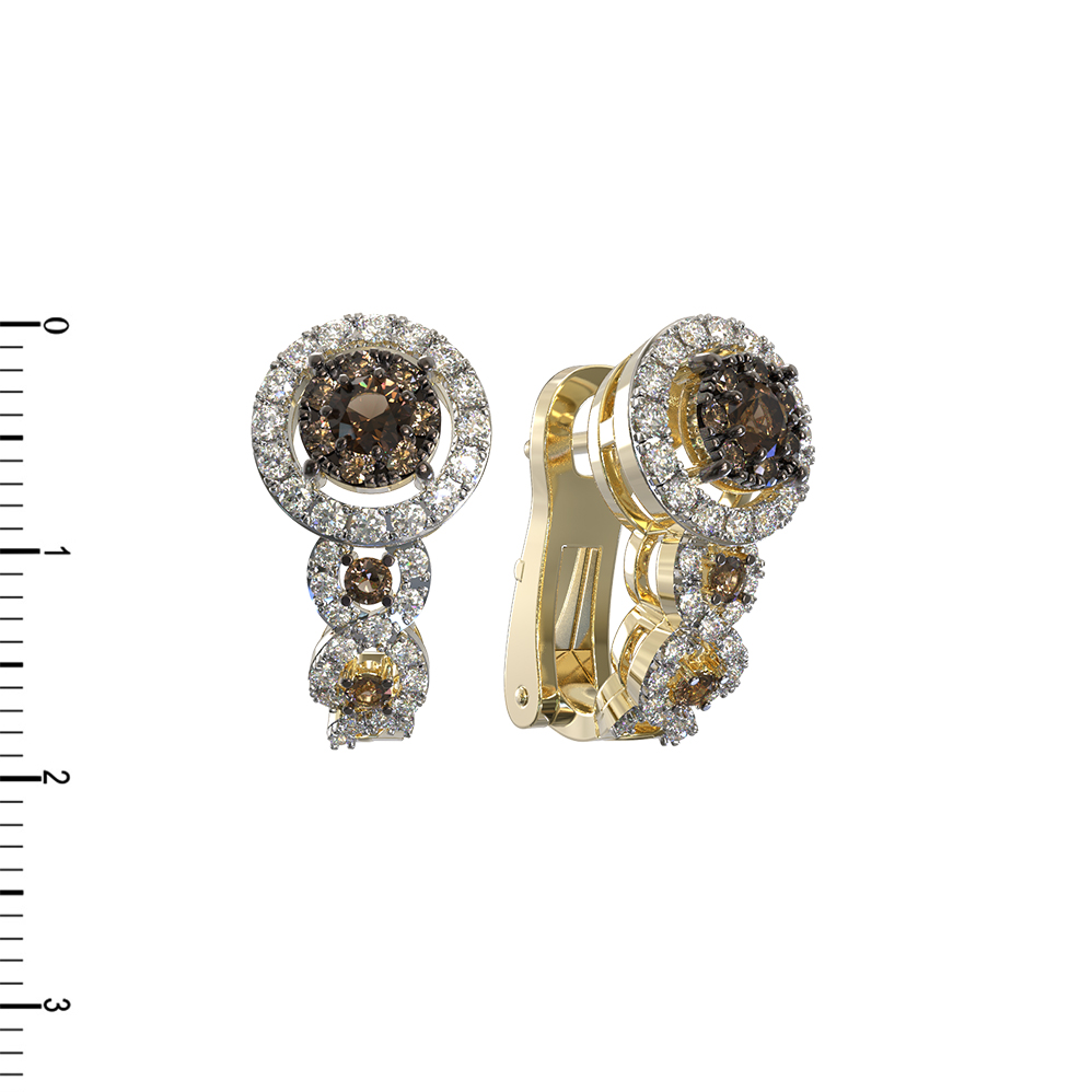 Роскошные серьги из лимонного золота 585 пробы из коллекции De Luxe Бриллианты — Espresso станут воплощением утонченного вкуса и высокого статуса. Благородный оттенок лимонного золота создает идеальную оправу для изысканной композиции, подчеркивая сияние драгоценных камней. Центральным элементом украшения выступают 84 бриллианта круглой формы, которые гармонично сочетаются с глубоким и насыщенным коричневым цветом основных вставок. Мастерская огранка камней позволяет им играть на свету, создавая завораживающие блики при каждом движении.