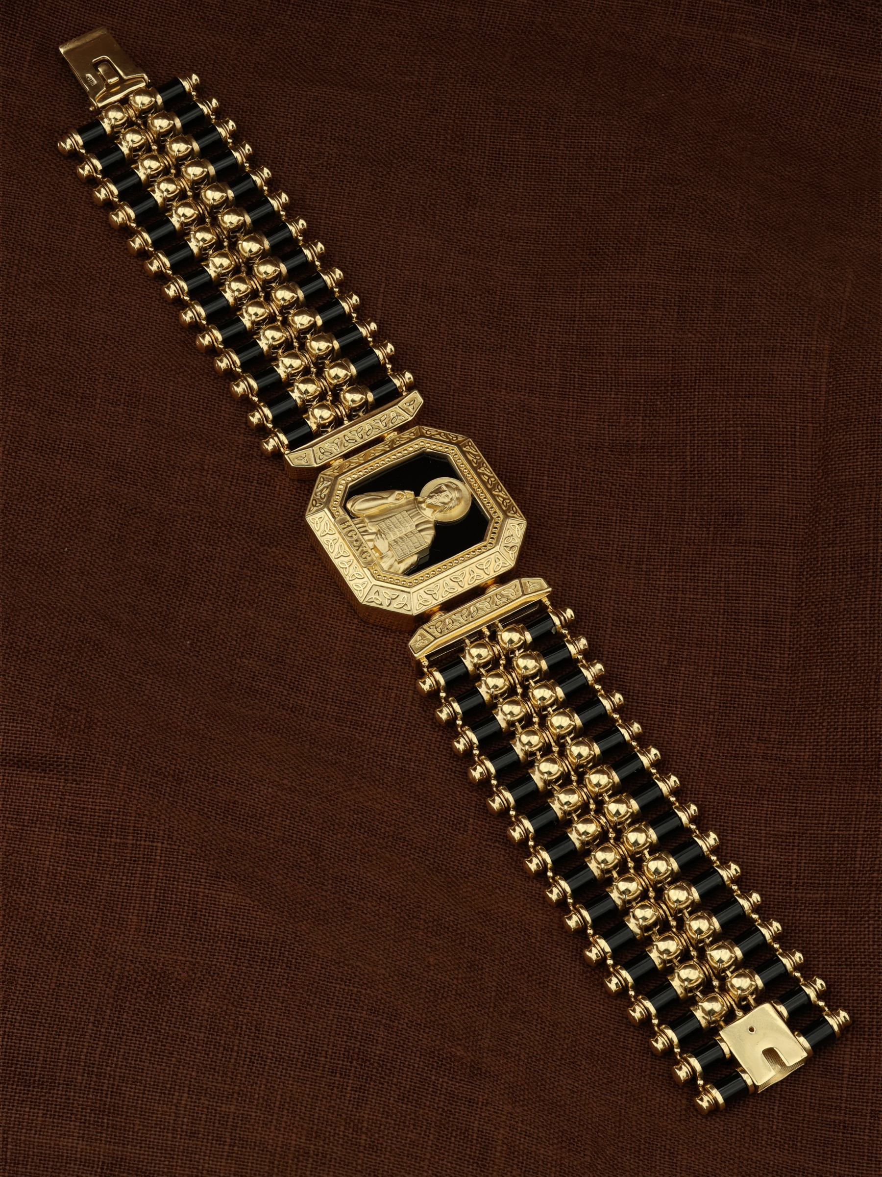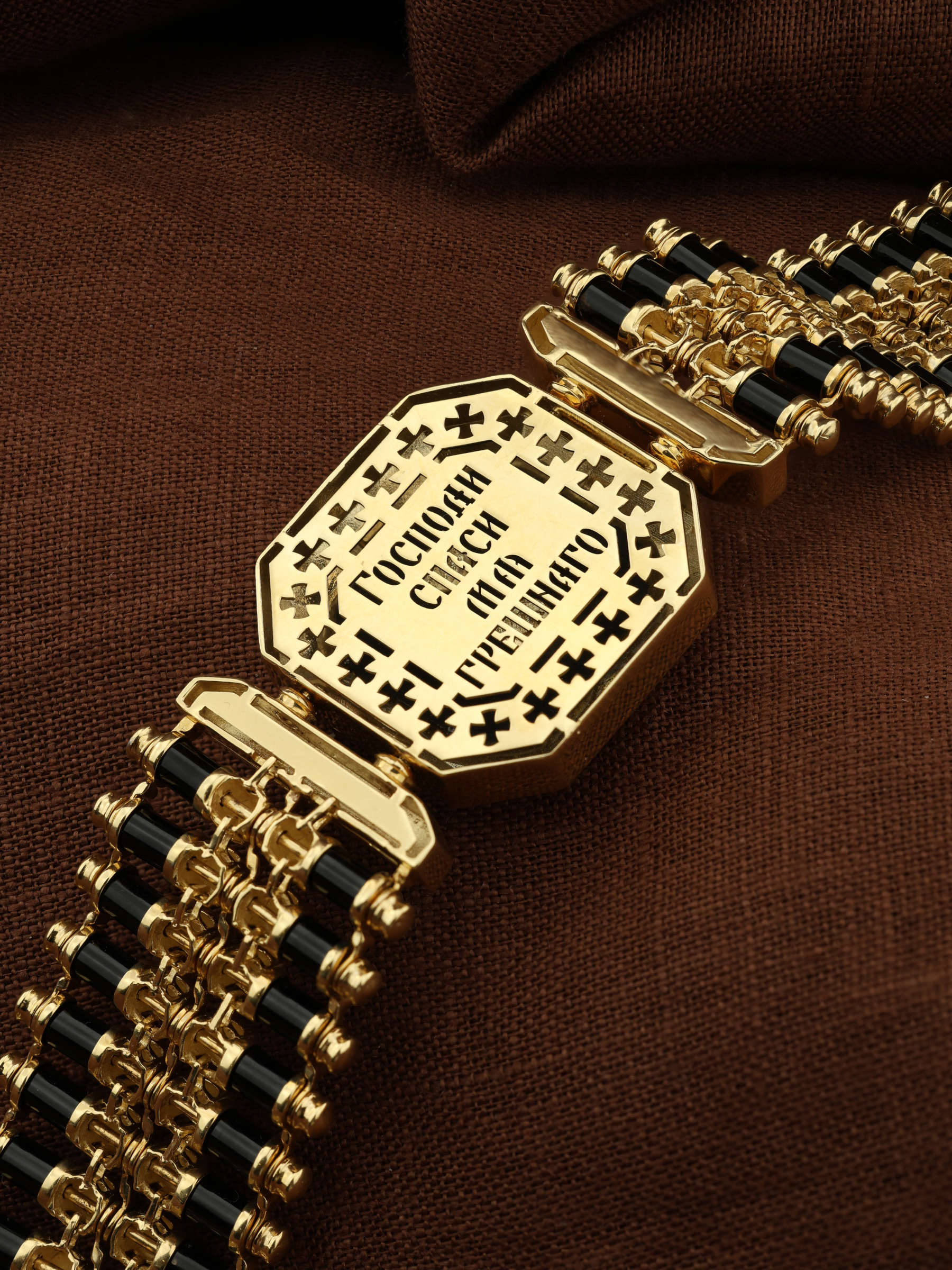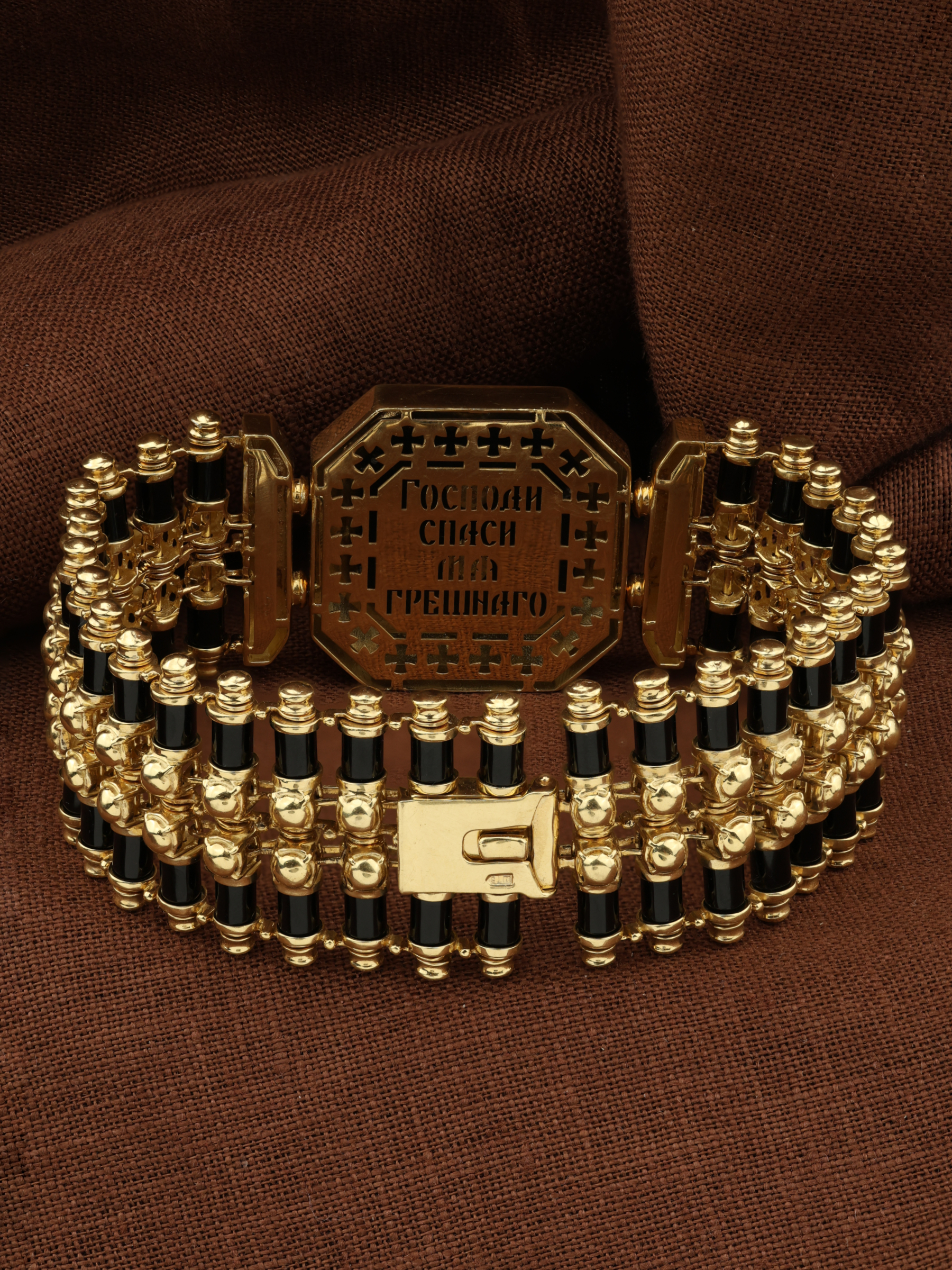 На лицевой стороне основного звена изображена икона Господа и Спасителя нашего Иисуса Христа — Господь Вседержитель или Пантократор (от греч. всевластный, всесильный). Он представлен как Царь Небесный и будущий Судия мира. Именование Иисуса «Вседержителем» указывает, с одной стороны, на Его Божественную природу: «Аз есмь Альфа и Омега, начало и конец, говорит Господь, Который есть и был и грядет, Вседержитель» (Откр. 1: 8). С другой стороны, такое именование связано и с человеческой природой Христа, искупившего крестной жертвой людские грехи и обновившего тем самым человеческую природу. Господь Иисусь Христос изображен фронтально огрудно. Главу Спасителя осеняет нимб, на нем угадывается крест. Крест символизирует голгофскую жертву Спасителя. По греческой традиции, на нимбе написаны буквы Омега, Омикрон, Ню — вместе они обозначают слово Сущий, одно из имен и характеристику Бога, согласно Священному Писанию. Правой рукой Он благословляет, а левой держит Евангелие — благую весть, принесенную Христом всему миру. Также означает она тот новый мир, который будет сотворен Богом после второго пришествия Христа. Символизирует и Книгу Жизни, где записаны имена всех, возлюбивших Бога. Всемогущий Бог предстает здесь не как обличающий судья, а как милостивый отец, ждущий возвращения блудных детей.
