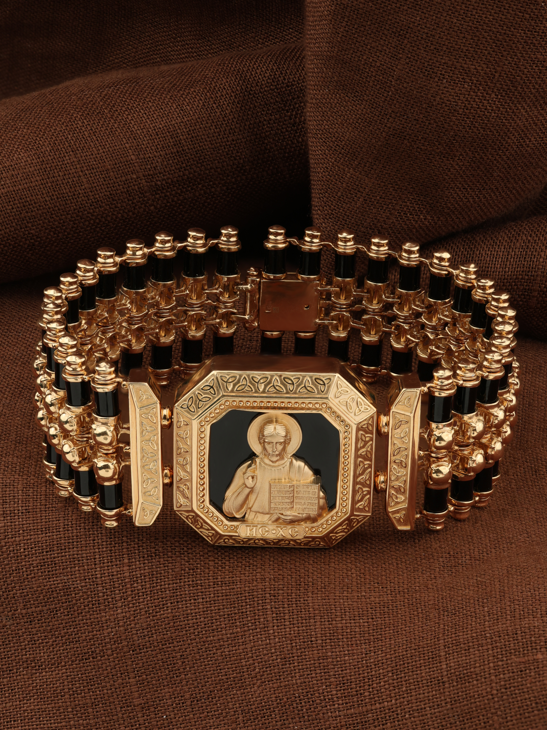 На лицевой стороне основного звена изображена икона Господа и Спасителя нашего Иисуса Христа — Господь Вседержитель или Пантократор (от греч. всевластный, всесильный). Он представлен как Царь Небесный и будущий Судия мира. Именование Иисуса «Вседержителем» указывает, с одной стороны, на Его Божественную природу: «Аз есмь Альфа и Омега, начало и конец, говорит Господь, Который есть и был и грядет, Вседержитель» (Откр. 1: 8). С другой стороны, такое именование связано и с человеческой природой Христа, искупившего крестной жертвой людские грехи и обновившего тем самым человеческую природу. Господь Иисусь Христос изображен фронтально огрудно. Главу Спасителя осеняет нимб, на нем угадывается крест. Крест символизирует голгофскую жертву Спасителя. По греческой традиции, на нимбе написаны буквы Омега, Омикрон, Ню — вместе они обозначают слово Сущий, одно из имен и характеристику Бога, согласно Священному Писанию. Правой рукой Он благословляет, а левой держит Евангелие — благую весть, принесенную Христом всему миру. Также означает она тот новый мир, который будет сотворен Богом после второго пришествия Христа. Символизирует и Книгу Жизни, где записаны имена всех, возлюбивших Бога. Всемогущий Бог предстает здесь не как обличающий судья, а как милостивый отец, ждущий возвращения блудных детей.