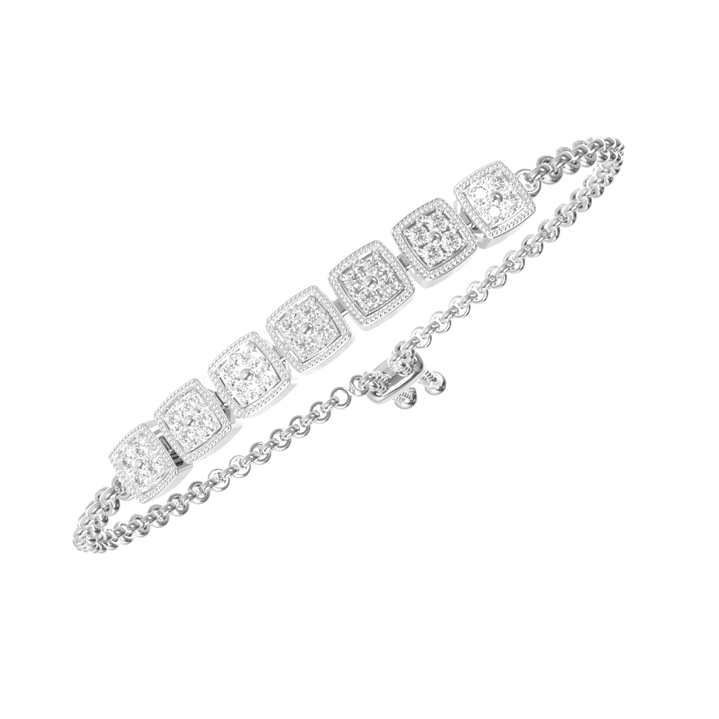 Центральная часть браслета украшена 28 бриллиантами круглой формы. Белые вставки гармонично сочетаются с холодным благородным блеском белого золота, создавая роскошную игру света при каждом движении. Особая конструкция изделия позволяет легко регулировать размер, что обеспечивает идеальную посадку на запястье.