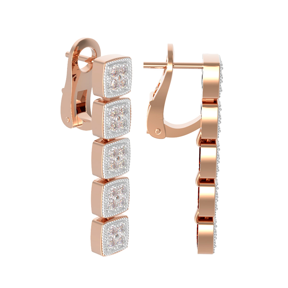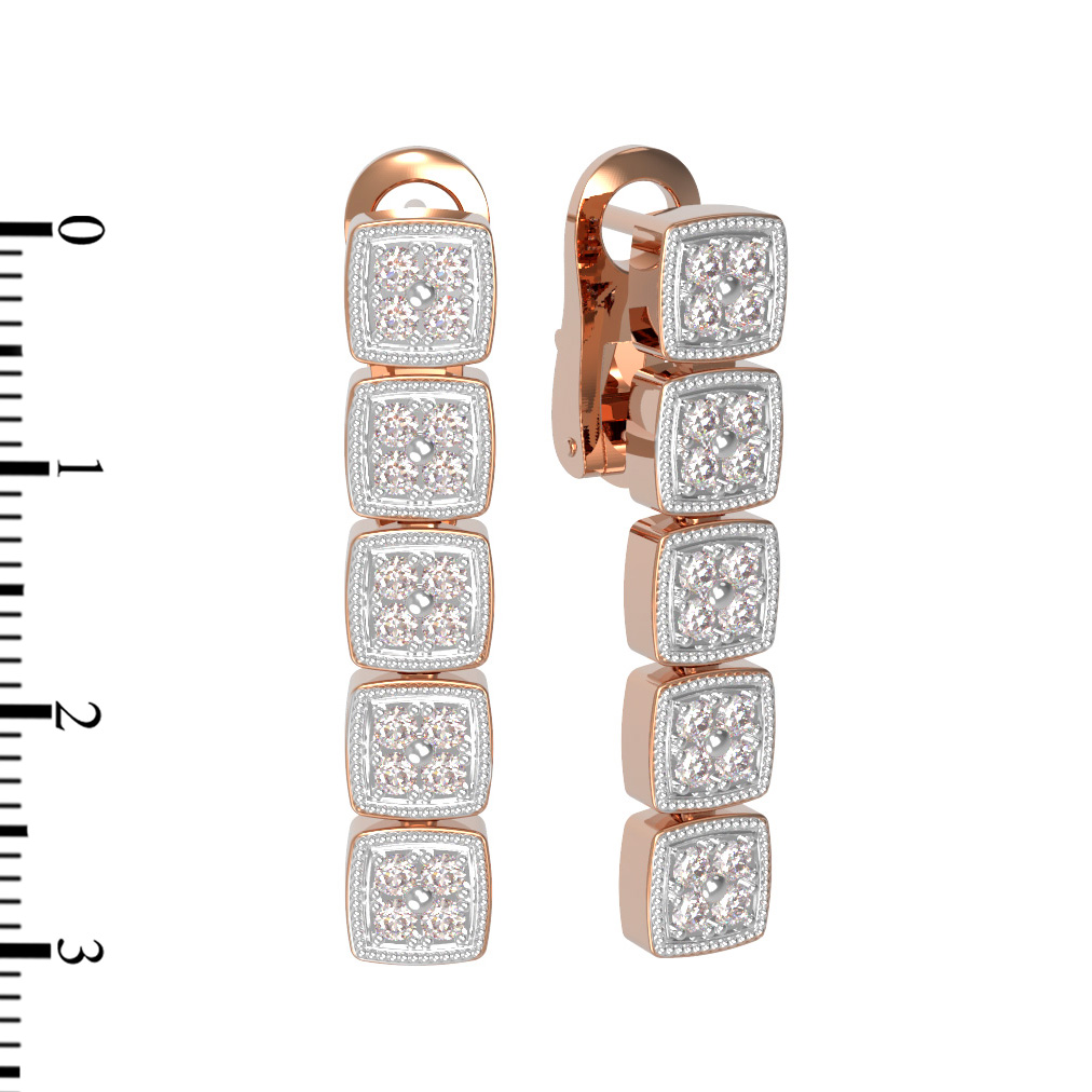 Серьги из красного золота 585 пробы из коллекции De Luxe Бриллианты — Quattro представляют собой воплощение изысканного стиля и высокого ювелирного мастерства. Это украшение создано для тех, кто ценит статус, лаконичность форм и безупречное качество исполнения. Дизайн модели отличается геометрической строгостью: основа выполнена в виде вертикальной линии из пяти квадратных элементов, что придает аксессуару визуальную стройность и современную эстетику.
